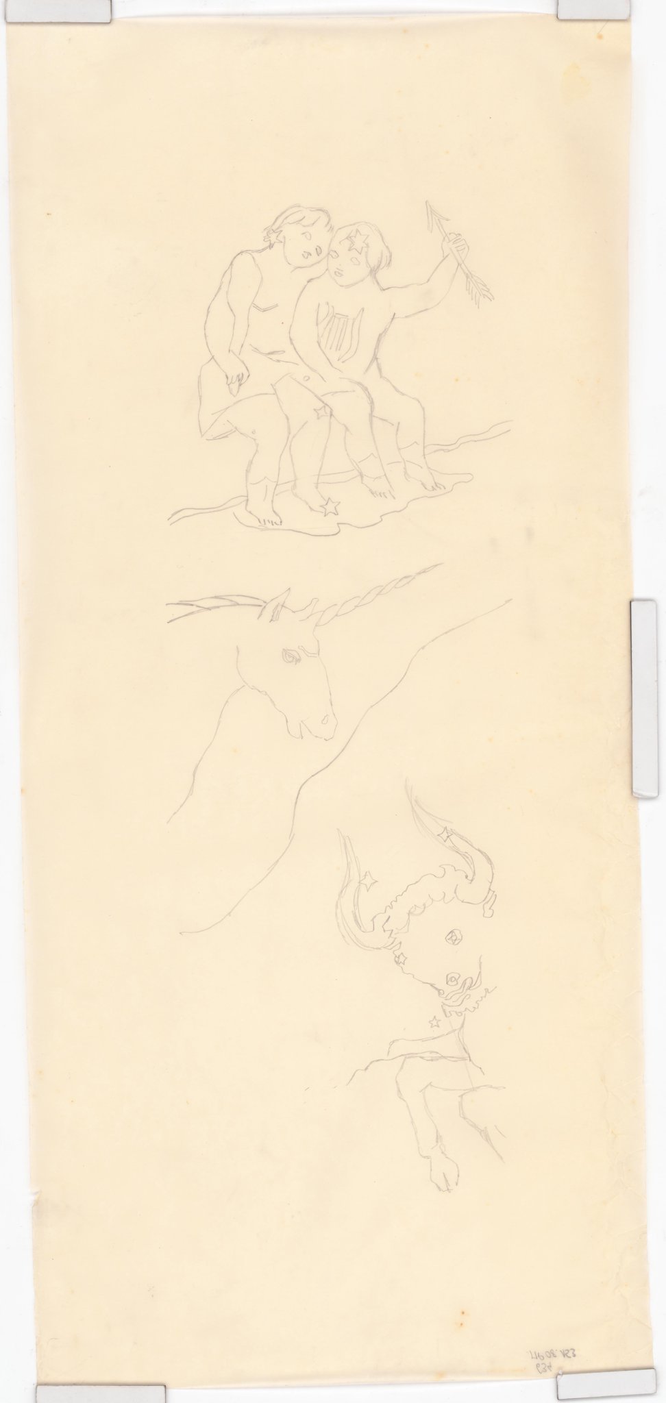 Projet pour les vitraux sur le thème de la "carte du ciel": personnification de plusieurs signes astrologiques et constellations. De bas en haut : les Gémeaux assis côte à côte, celui de droite tenant une flèche et une lyre, la Licorne, dont seul le buste est représenté, et le Taureau, dont seul le buste et les pattes sont également esquissés.