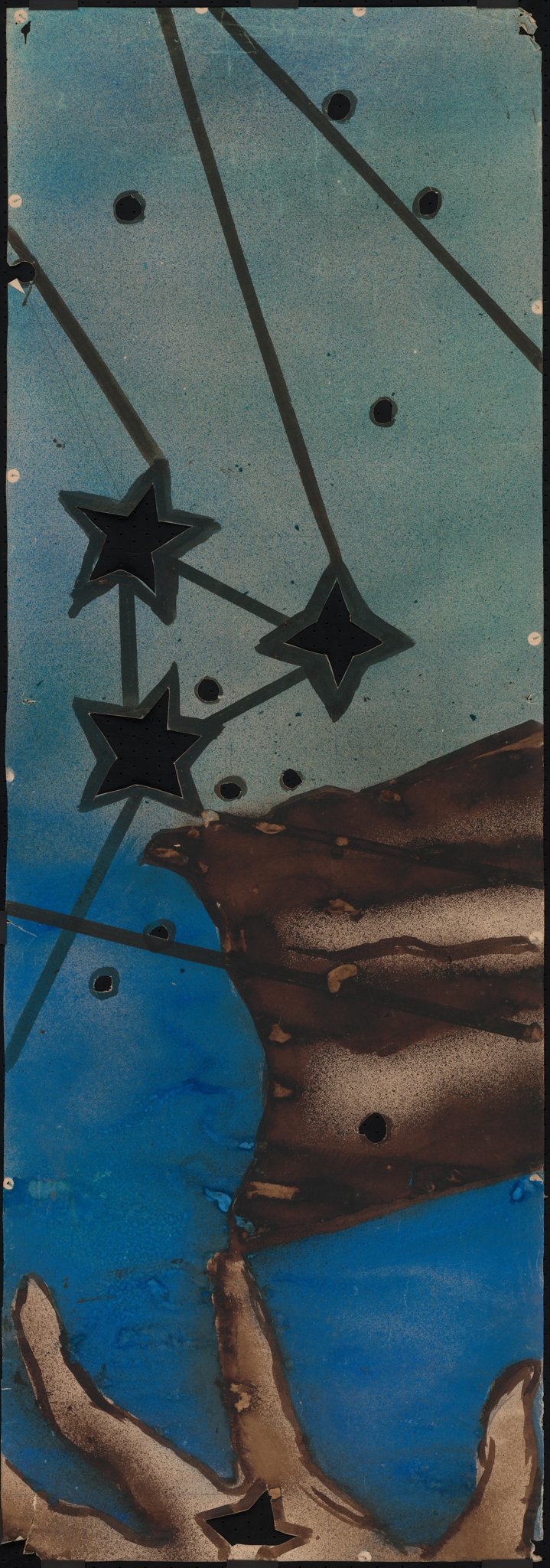 Carton pour des vitraux sur le thème de la "carte du ciel" : en bas, bout des doigts de la personnification de la constellation de la Lyre, et partie brune correspondant à la base de la représentation de la Lyre. La composition est traversée par les lignes des constellations et parsemée d'étoiles découpées.