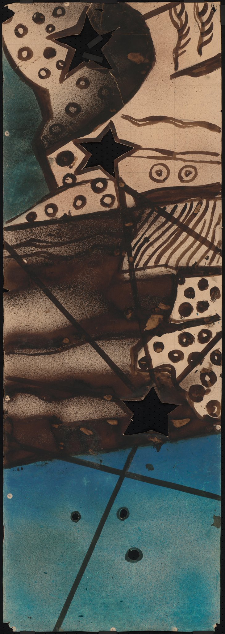 Carton pour des vitraux sur le thème de la "carte du ciel" : bas de la représentation de la constellation de la Lyre. La composition est traversée par les lignes des constellations et parsemée d'étoiles découpées.