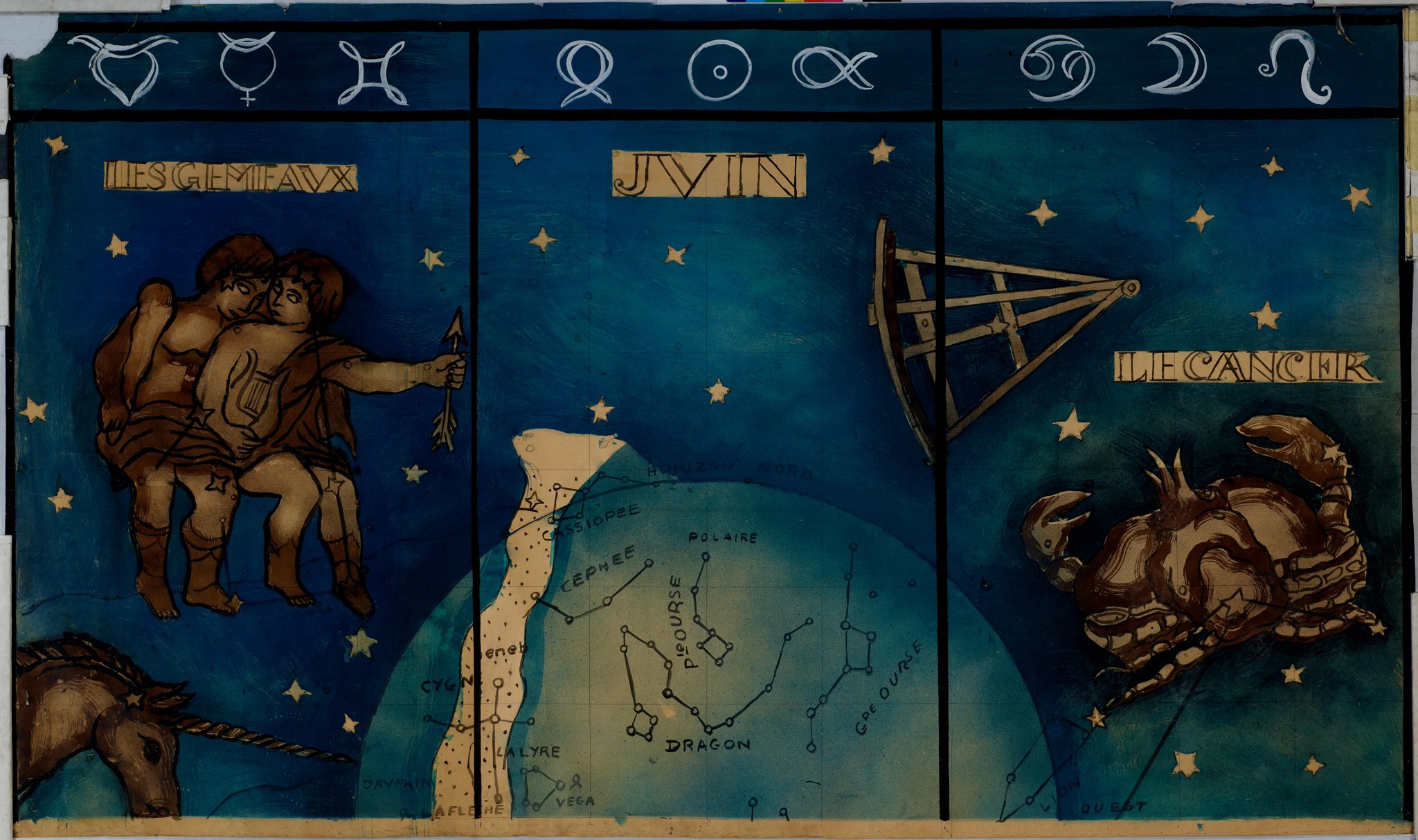 Projet en couleur pour les vitraux sur le thème de la "carte du ciel" : les personnifications des signes des Gémeaux, à gauche, et du Cancer, à droite, autour d'un cercle central comprenant les constellations, (dont seule la moitié supérieure est dessinée ici). La personnification de la constellation de la Licorne est représentée en bas à gauche, et celle de la constellation du Compas en haut à droite. Au sommet, on trouve les symboles des signes du zodiaque. (L'ensemble est complété par MP 08.170). Au verso : projet pour les vitraux sur le thème de la "carte du ciel" des Pressoirs du Roy de Fontainebleau (non réalisés): les personnifications des signes de la Vierge, à gauche, et des Poissons, à droite, autour d'un cercle central comprenant les constellations, (dont seule la moitié supérieure est dessinée ici). En haut à droite, on aperçoit la personnification de la constellation du Corbeau, et au sommet, les symboles des signes du zodiaque (l'ensemble est complété par le verso du MP 08.170).