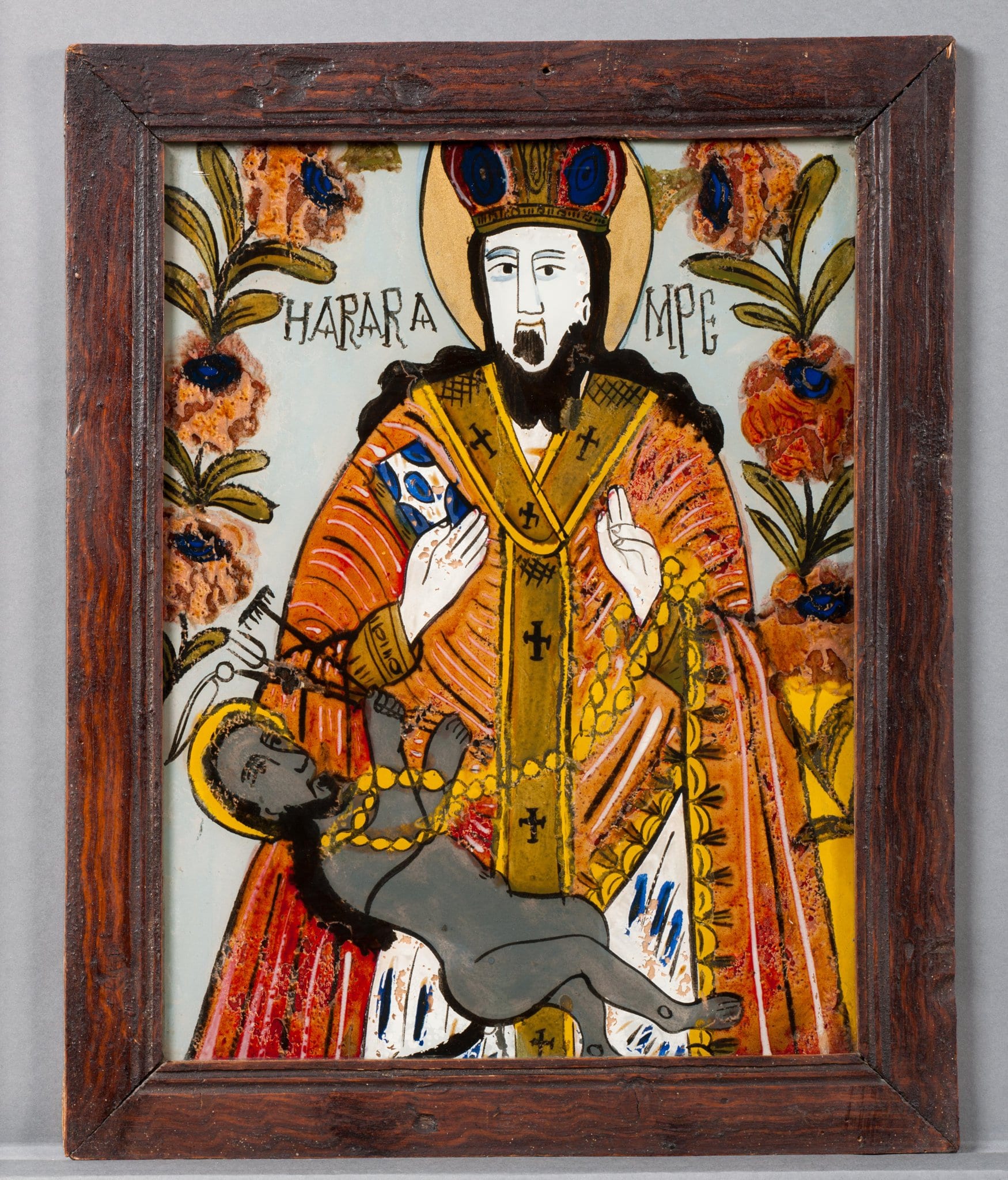 Ikonen des hl. Charalampius waren vor allem auch in der siebenbürgischen Hinterglasmalerei beliebt. Der Heilige nahm im Volksglauben und in der Volksmedizin eine wichtige Stellung ein, die bei drohendem Ausbruch von Seuchen und Krankheiten stets anstieg. Das Hinterglasgemälde des thronenden Heiligen wurde nach einer seitenrichtigen Vorlage gemalt, so dass er mit der linken Hand segnet und die Hände der Figuren verkehrt gezeichnet erscheinen.
