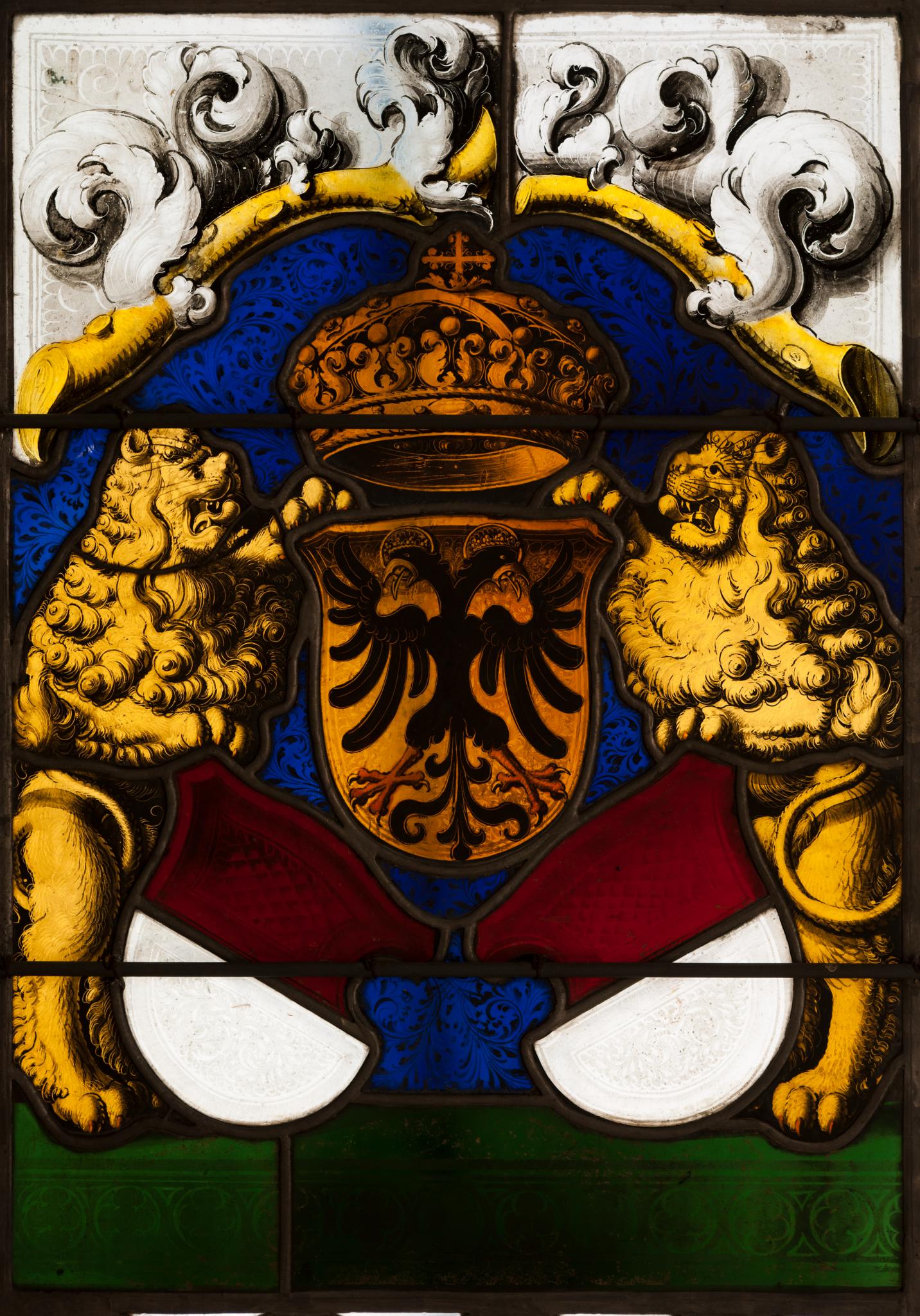 Farbloses und fabiges Glas; Bemalung mit Schwarzlot und Silbergelb.