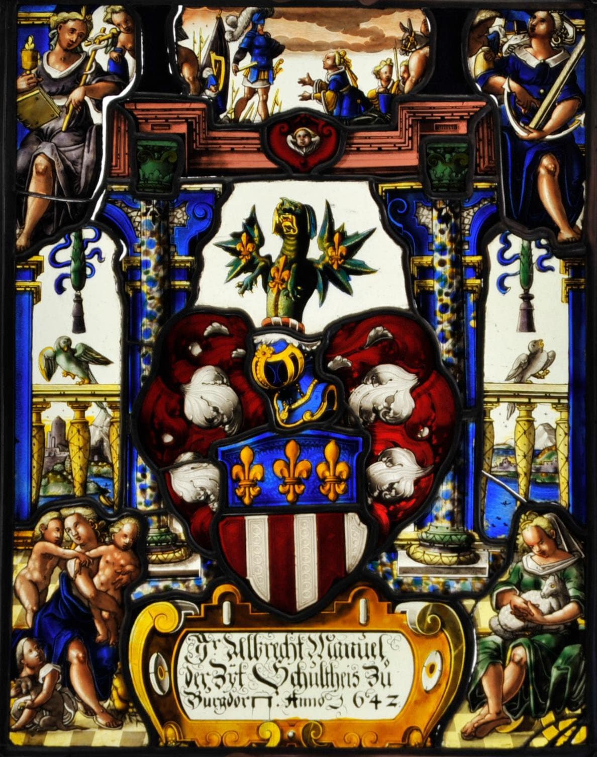 Das Vollwappen Albrecht Manuels steht auf der gelben Rollwerkkartusche mit dem Stifternamen. Es erscheint vor einer dreiachsigen Galerie aus blauen Pfeilern und vorgesetzten marmorierten Säulen. Darüber zieht sich ein verkröpftes rosa Gebälk hin. Die beiden schmalen Seitenöffnungen sind im unteren Teil mit einer Balustrade belegt, auf der je ein Vogel sitzt. Durch deren Baluster fällt der Blick auf eine Seelandschaft. Die Bildecken füllen vier sitzende weibliche Allegorien. Es handelt sich um die Tugenden des Glaubens und der Hoffnung (oben links und rechts) sowie um diejenigen der Barmherzigkeit und der Geduld (unten links und rechts). Das Oberbild zeigt den gerüsteten David und vor ihm kniend Abigail, die diesen um Gnade für Nabal bittet (1 Sam 25, 25). In ähnlicher Form findet sich diese Bibelszene auf der Scheibe David Zeenders von 1661 im Bernischen Historischen Museum (BHM Bern, Inv. 4257).