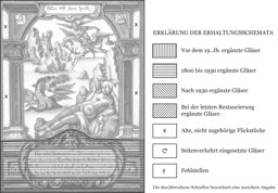 Die Gläser in der Fusszone neu ergänzt; alte (ornamentale) Flickstücke an beiden Seitenrändern; ein Sprungblei und ein Sprung; die Verbleiung erneuert; rückseitig die eingeritzte Brandmarke "3" auf allen originalen Gläsern.