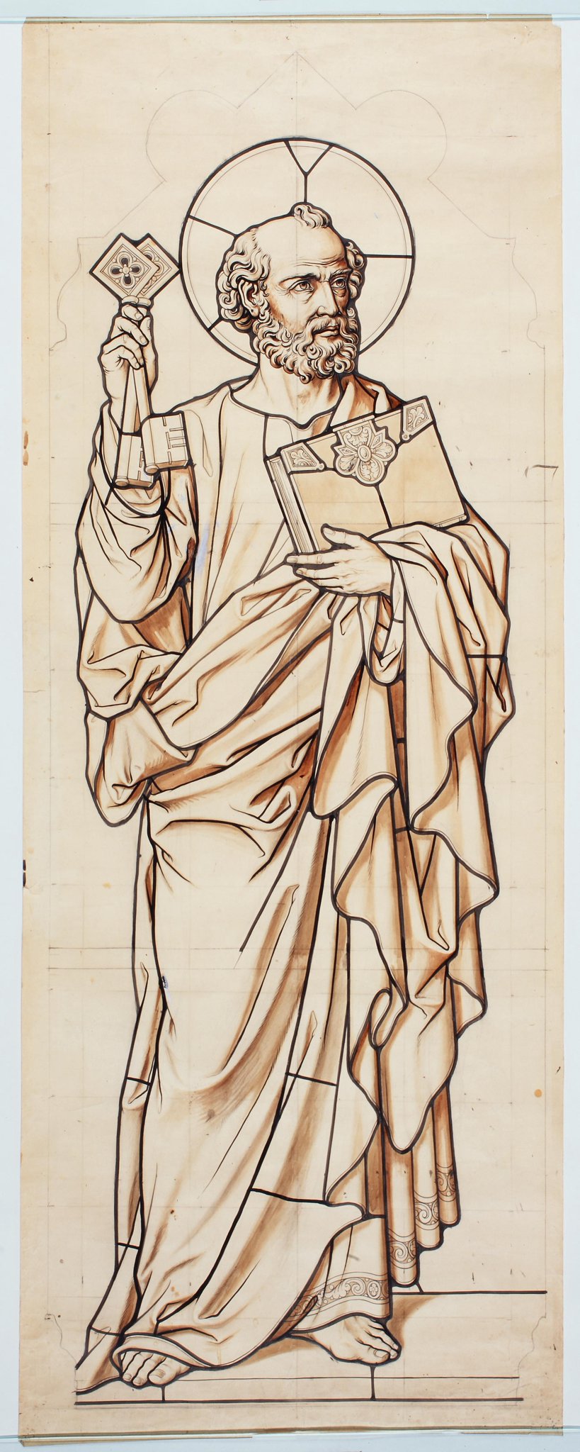 Ce carton en noir et blanc est le modèle précis à l’échelle 1:1 de la partie figurée du vitrail consacré à saint Pierre situé à gauche du vitrail axial dans le choeur de la nouvelle église Sankt Stephan au Jaun. Toute la partie décorative manque mais la forme de l’ouverture est indiquée avec précision.
