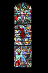 Ce carton en couleur est le modèle précis à l’échelle 1:1 du vitrail consacré au Christ rentrant à Jérusalem, Christ chassant les marchands du temple, Noces de Cana pour la première fenêtre à gauche dans la nef de la chapelle de la Paix à l’église Sainte-Thérèse dans le quartier de Champel à Genève.