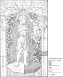Die rechte Hälfte des Podiums, ein Glas in der rechten Seitenrahmung mit dem angrenzenden Damaststück und kleine Stücke links vom Heiligenkopf neu ergänzt; Sprungbleie; die Verbleiung erneuert.