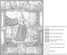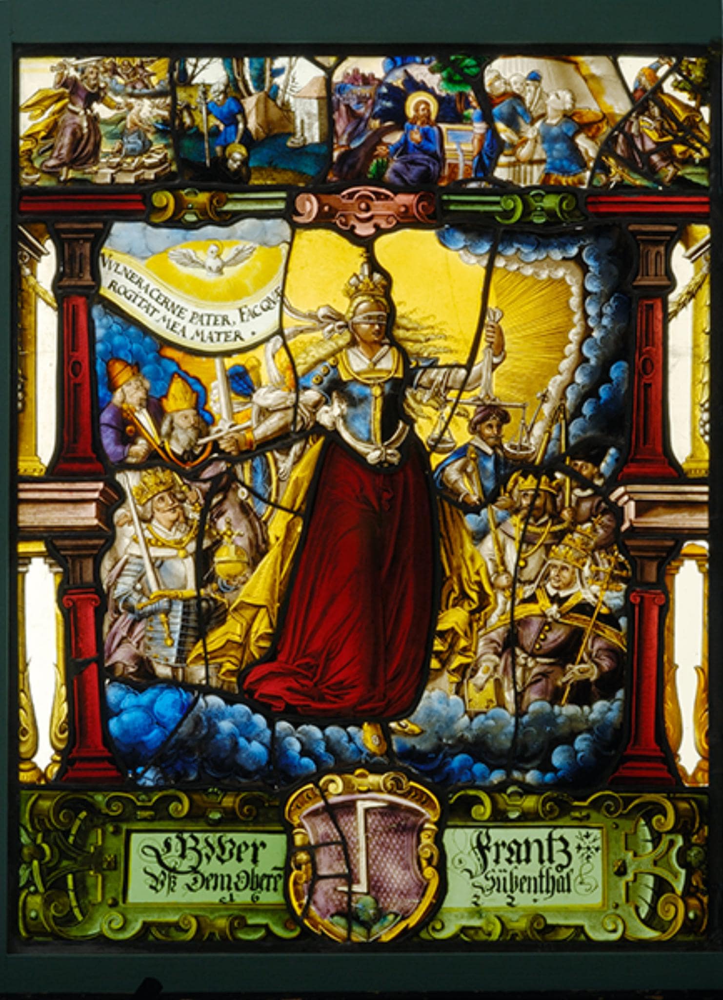 Im Zentrum schwebt über einem blauen Wolkenband die von gleissendem Sonnenlicht umstrahlte Justitia in langem rotem Rock und gelbem Mantel. Mit gekröntem Haupt und verbundenen Augen hält sie in den Händen Richtschwert und Waage. Zu ihren Füssen sind in den Wolken Kaiser, Papst, Sultan und weitere Regenten versammelt. Das Glas mit der Taube des Heiligen Geistes und der Fürbitte-Botschaft Christi auf einem lateinischen Schriftband ("Schau meine Wunden, Vater, und mach, worum meine Mutter bittet") ist ein altes Flickstück aus einer anderen Scheibe. Im Oberbild sind nur die linke Ecke mit Abraham bei der Opferung Isaaks sowie das Stück am rechten Rand original. Die drei Szenen dazwischen sind gleichfalls Flickstücke (Ermordung des hl. Meinrad; Christus und die Samariterin am Brunnen; unidentifizierte Darstellung [laut Foto SNM Zürich angebliche Bekehrung Sauls]). Die Hauptszene rahmt ein fragiles doppelstöckiges Architekturgebilde aus Pfeilern, Säulen und einem zierlichen Gebälk. Damit kontrastiert die den Scheibenfuss füllende grüne Kartusche aus üppigem Rollwerk, der im Zentrum das Stifterwappen aufgesetzt ist.