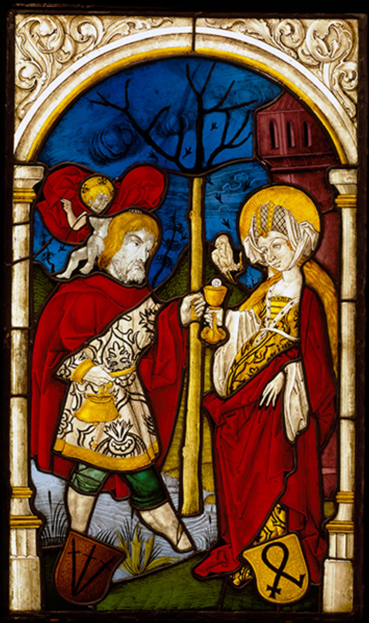Links erscheint Christophorus, der mit dem Christkind auf seinen Schultern und den Baumstrunk in der Hand durch den Fluss watet. Ihm gegenüber steht am Ufer auf grünem Wiesengrund die hl. Barbara. Mit dem Hostienkelch in ihrer Rechten befindet sie sich vor dem Turm, in dem sie gefangen war. Die beiden Gestalten sind in kostbare Brokatgewänder und rote Umhänge gehüllt. Die hl. Barbara, die Namenspatronin Barbara Tilliers, trägt zudem modischen Kopfschmuck. Hinter den Figuren ist eine Hügellandschaft unter blauem, von Vögeln belebtem Wolkenhimmel dargestellt. Beim mittleren Hügel ist unter einem schwarzen Baum ein kerzenhaltender bärtiger Mann zu sehen, der aus einer Höhle (Erdloch) hervorzutreten scheint. Bei ihm wird es sich um den Eremiten handeln, durch den sich Christophorus bekehren liess (Lehmanns Gleichsetzung dieser Figur mit dem hl. Beat, dem Namenspatron des Stifters, trifft kaum zu). Weshalb Beat Ludwig Michel Christophorus auf seiner Scheibe anbringen liess, bleibt unklar. Die Wappen des Donatorenpaares befinden sich zu Füssen beider Hauptfiguren. Die Architekturrahmung bildet eine zierliche Arkade aus schlanken Säulchen und einem schlichten Rundbogen mit Rankenwerk als Zwickelfüllung.