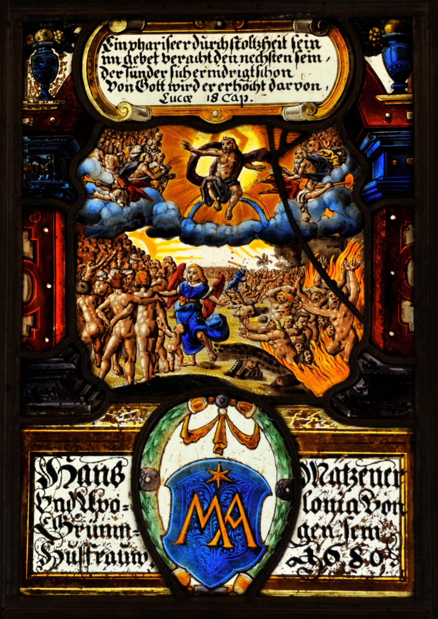 Die zentrale Figurenszene schildert das Jüngste Gericht mit Christus, der als Weltenrichter zwischen den Erlösten im Himmel thront, während unten auf Erden der Erzengel Michael seines Amtes waltet, indem er die Seligen von den Verdammten in der Hölle trennt. Die Darstellung erläutert die oben am Bogen der roten Rahmenarkade angebrachte Kartuscheninschrift. Diese Arkade ruht auf dem hohen Podium, an dessen Front die Stifternamen und das oval umkränzte Wappen (s. u.) festgehalten sind.