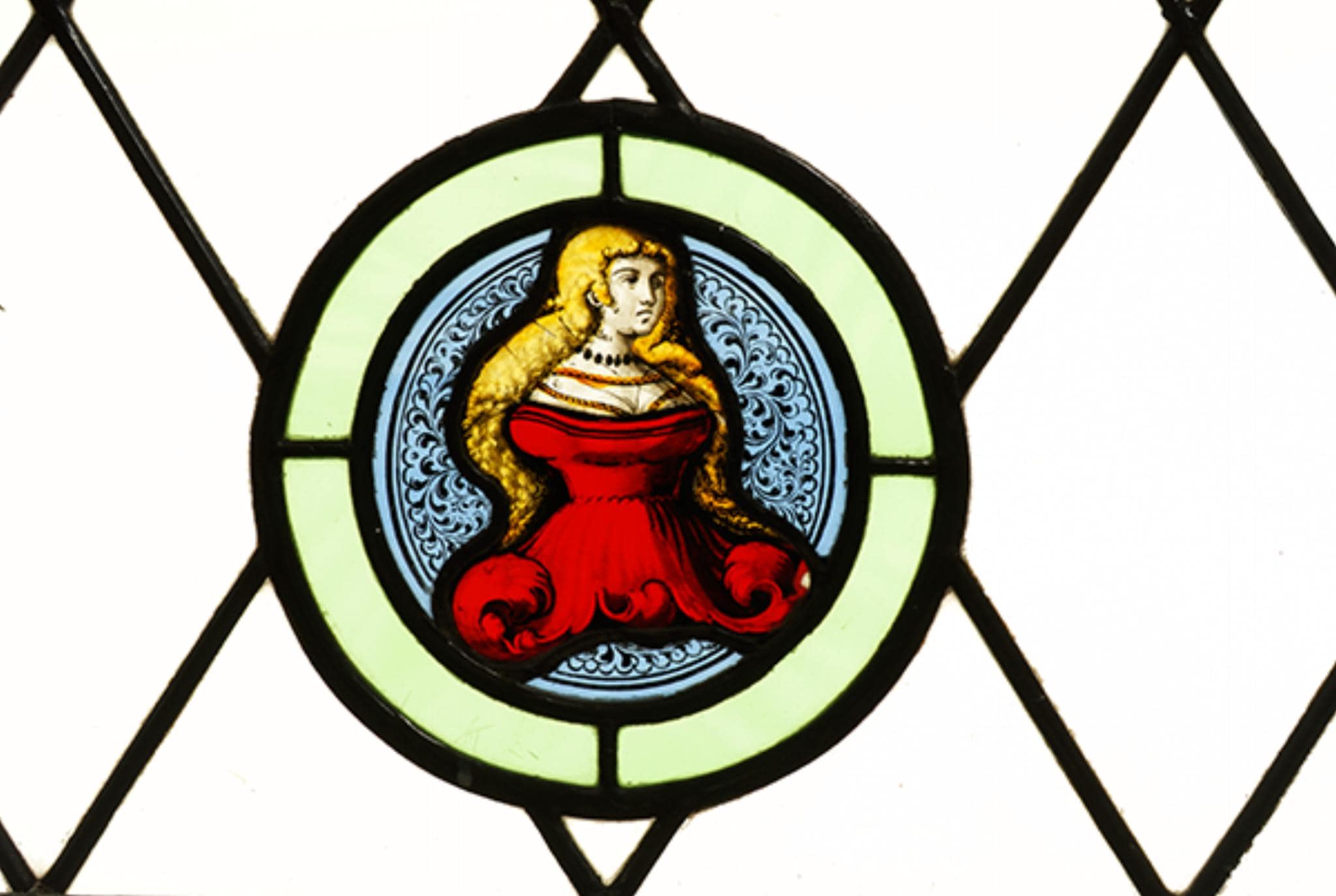 Das zu einem Rundscheibchen ergänzte Fragment zeigt eine weibliche Büste in roter Kleidung. Ihre dichten blonden Locken legen sich üppig über ihre Schultern. Den breiten Ausschnitt zieren mehrere Ketten.