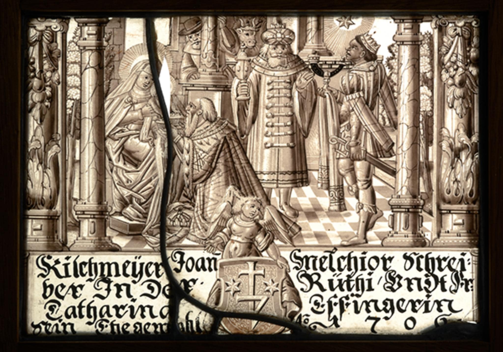 Die Scheibe des Bernischen Historischen Museums ist wie jene verwandte im Museum Burg Zug dem Zuger Glasmaler Franz Josef Müller zuzuschreiben. Die Vorlage für das Hauptbild mit der Anbetung der Könige ist in analoger Form bereits auf einer 1639 von Kaspar Letter gestifteten Bildscheibe und einer Figurenscheibe Melchior Schribers und Katharina Brüderlins 1640 verwendet worden (Museum Burg Zug; Bergmann 2004, Nr. 124 und Foto SNM Zürich 104841). Das graphische Vorbild ist bislang jedoch unbekannt.