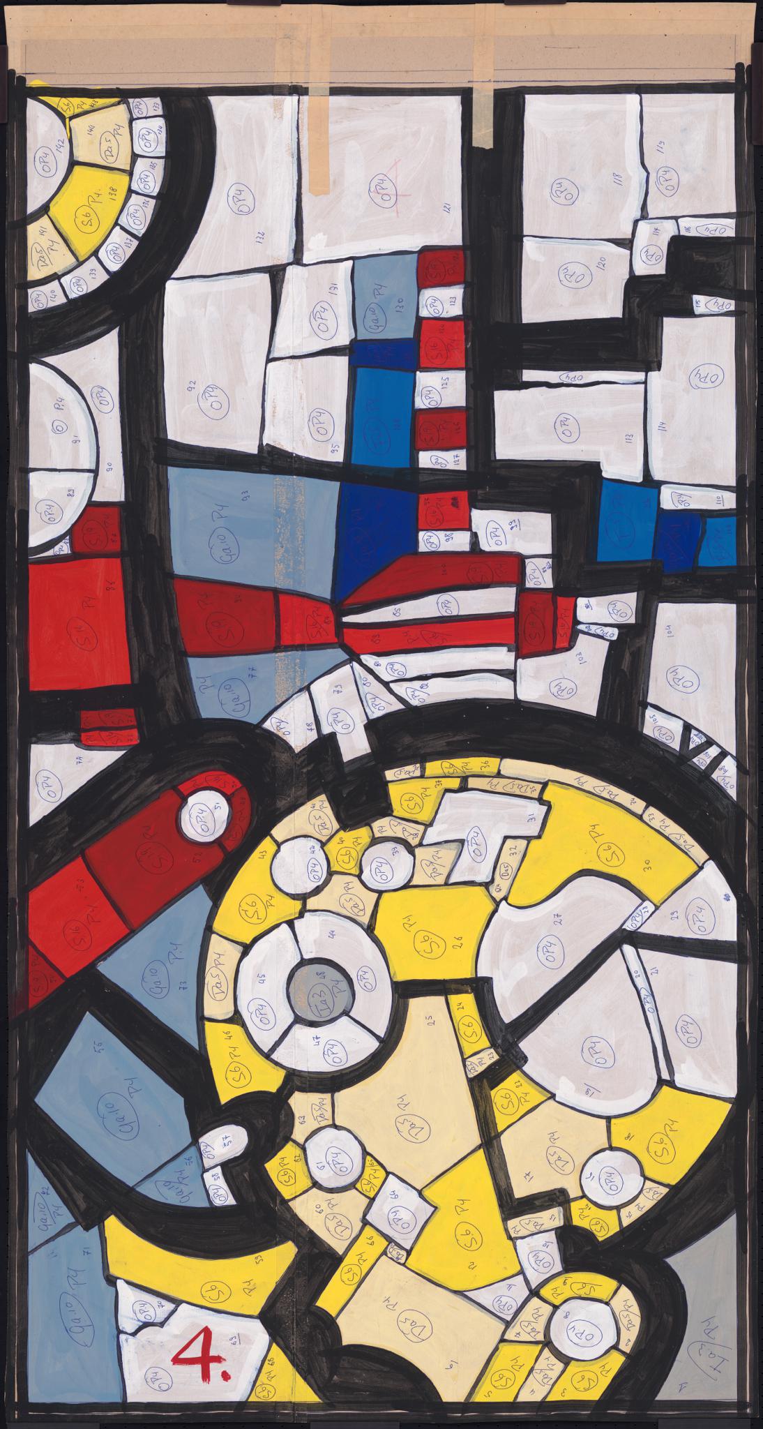 Ce carton correspond au quatrième panneau du registre supérieur (N° 4) de la grande dalle de verre réalisée en 1967 à Granges (SO) pour la villa d’Alfred Fischer, alors directeur de la manufacture de montres Baumgartner Frères SA à Granges. La dalle est constituée de quinze panneaux, que l’artiste a numérotés de 1 à 15, de gauche à droite et de haut en bas. La maquette PT_1 en présente la totalité. Le chiffre rouge 4 indique le numéro de panneau, alors que les autres inscriptions (chiffres et lettres) se rapportent d’une part à la numérotation des pièces de verre (de 1 à 144), d’autre part aux références des couleurs choisies.