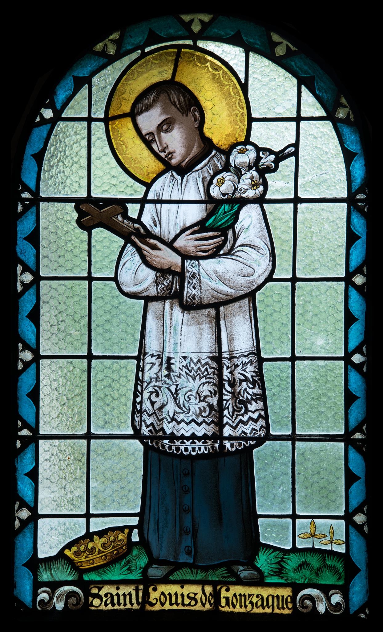Ce vitrail consacré à saint Louis de Gonzague se situe dans la troisième fenêtre à droite dans la nef de la chapelle Notre-Dame-de-la-Brillaz à Prez-vers-Noréaz. Ce petit sanctuaire, lieu de pèlerinage local, est édifié en 1926-1927 par l’architecte fribourgeois Léon Hertling (Lauper, 2012, p. 240). Douze petits vitraux ornent l’ensemble des fenêtres. C’est l’artiste-architecte Jean Crivelli (trois maquettes pour cette chapelle issues du Fonds graphique de l’atelier Kirsch & Fleckner KF_122, KF_162 et KF_163 sont signées de ses initiales JC) et l’atelier fribourgeois Kirsch & Fleckner qui en sont les auteurs. Le cycle date de la construction du bâtiment en 1927 (le vitrail de sainte Cécile est signé et daté en bas à droite : KIRSCH et FLECKNER / FRIBOURG . 1927.).