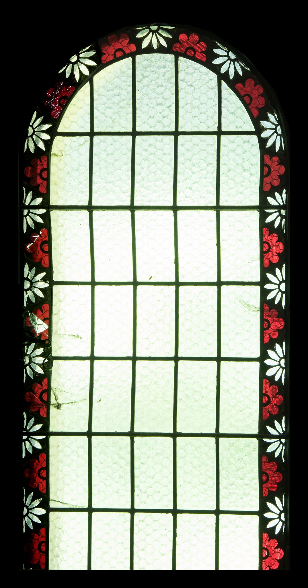 Ce vitrail à bornes rectangulaires est encadré d’une fine bordure composée en alternance de deux types de fleurs stylisées rouges et blanches.