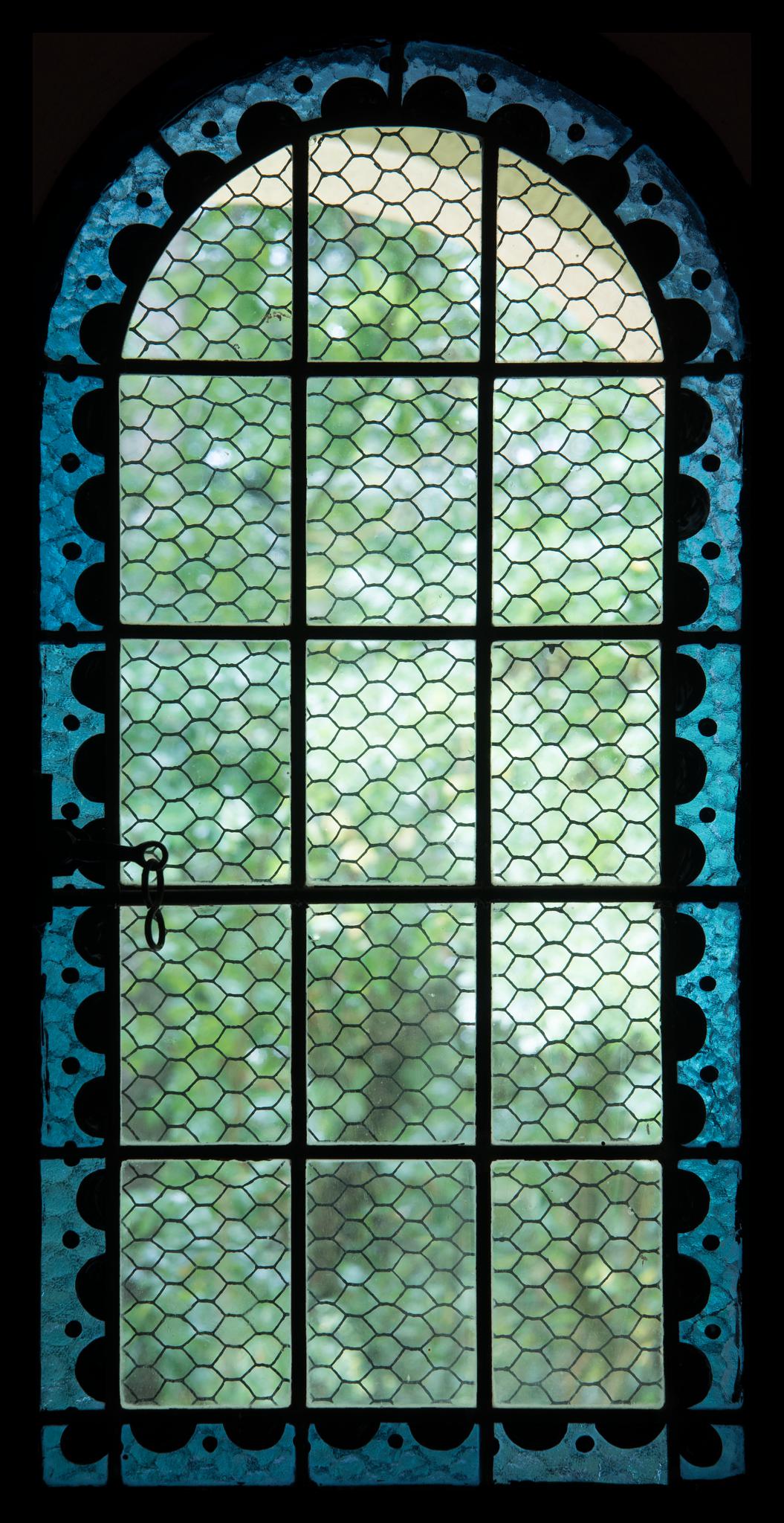 Ce vitrail à bornes rectangulaires est encadré d’une fine bordure noire et bleue composée de demi-cercles alternant avec des points.