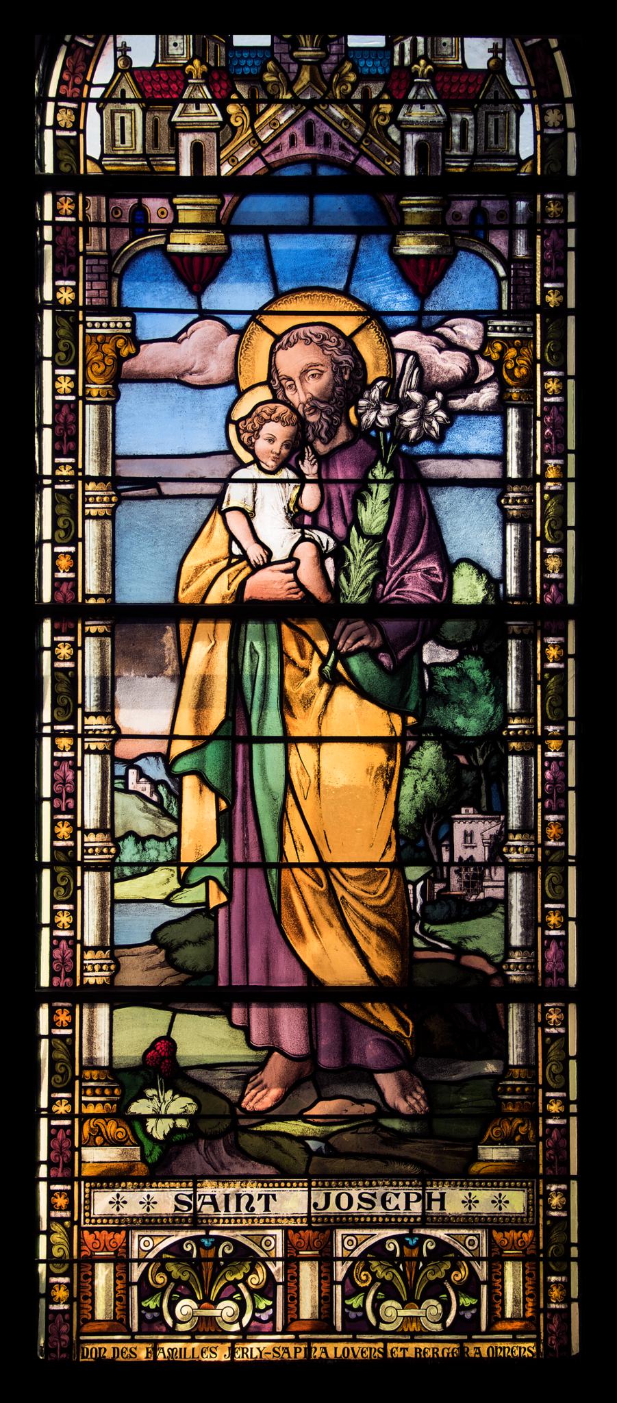 Ce vitrail consacré à saint Joseph se situe dans la deuxième fenêtre à droite dans la nef de l’église Saint-André à Onnens.