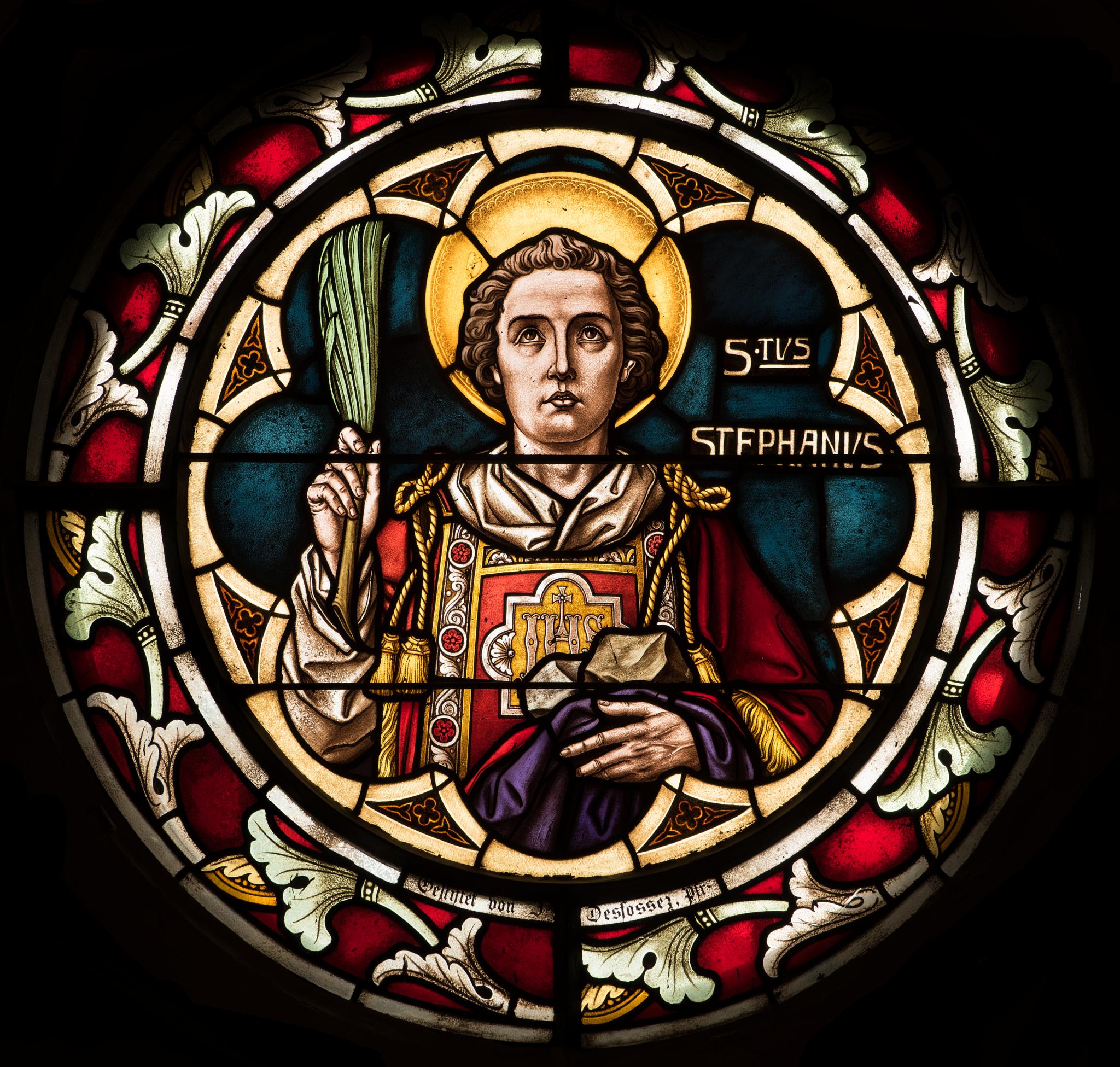 Saint Etienne est inscrit dans un médaillon polylobé. En buste, il est présenté de face et regarde vers le haut. Il tient de sa main droite la palme du martyr et de la gauche les pierres de sa lapidation. Sur sa dalmatique figure le monogramme “IHS”.