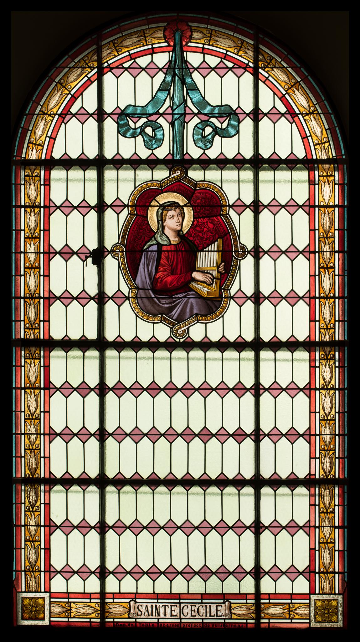 Cette verrière se situe dans la deuxième fenêtre de gauche de la nef de l’église Notre-Dame-de-la-Nativité de Vuisternens-devant-Romont, important édifice néo-classique du canton de Fribourg (Lauper, 2012, p. 204). Le cycle des vitraux de cette église a été réalisé par l’atelier Kirsch & Fleckner en 1906. Ce vitrail est un don du préfet Tobie Oberson de Vuisternens, comme l’indique l’inscription s’y trouvant.