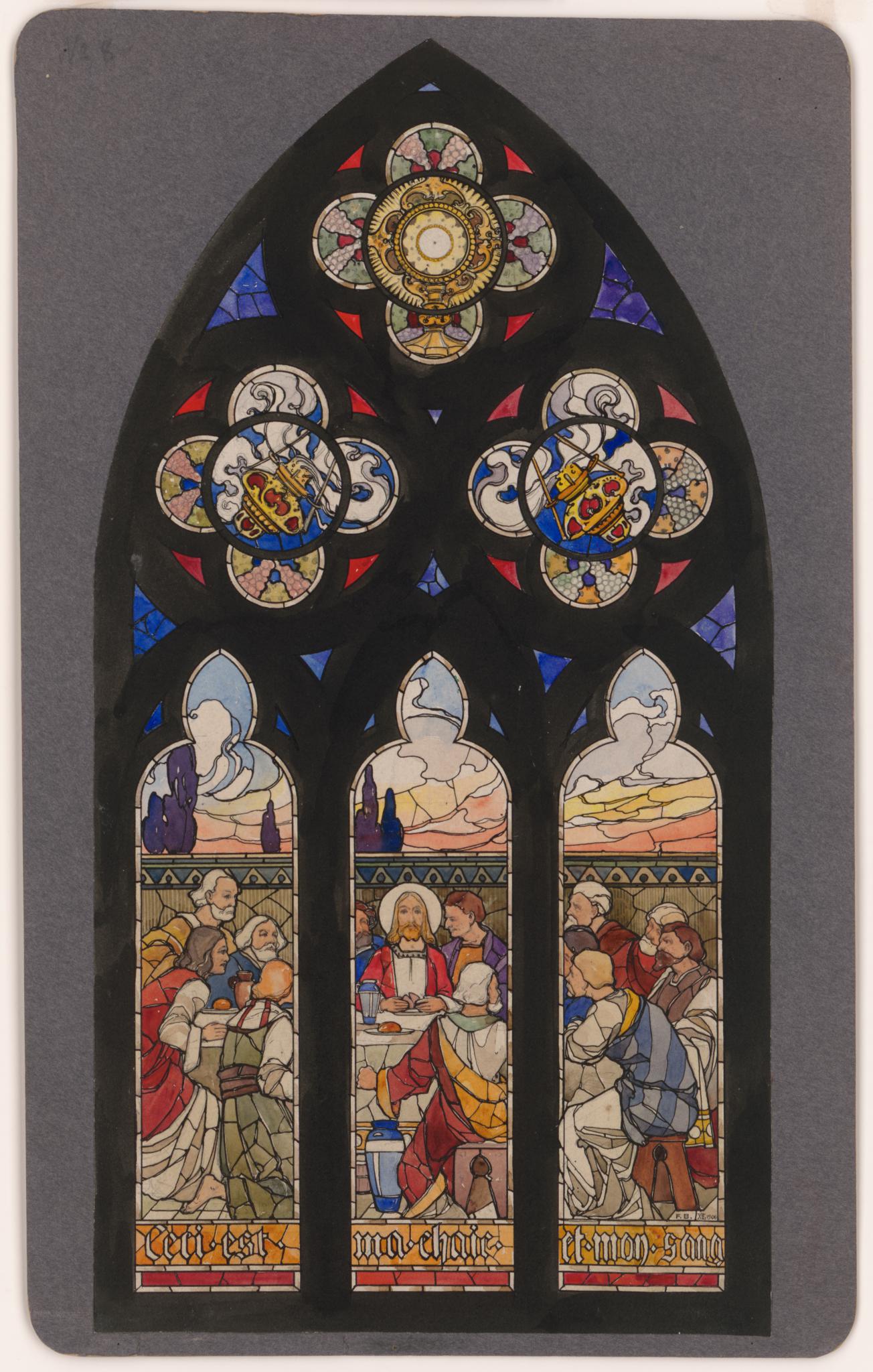 Maquette pour une verrière à trois lancettes lancéolées surmontées de trois quadrilobes et d'écoinçons dans le tympan. Les trois lancettes sont traversées par une composition unique. Le Christ est représenté au centre de face, rompant le pain, accompagné des disciples répartis autour de la table. La scène se déroule dans un espace architectural délimité par un mur en pierre bordé d’une frise décorative, au-dessus duquel on aperçoit des arbres sur un fond de ciel. Une grande inscription se déploie en bas. Dans le tympan, les deux quadrilobes inférieurs comportent des encensoirs en mouvement dégageant de la fumée, entourés de feuilles de vigne et de grappes de raisin. Dans le quadrilobe supérieur figure un ostensoir doré, également entouré de grappes de raisin. Les écoinçons, non-figuratifs, sont traités avec du verre bleu et rouge.