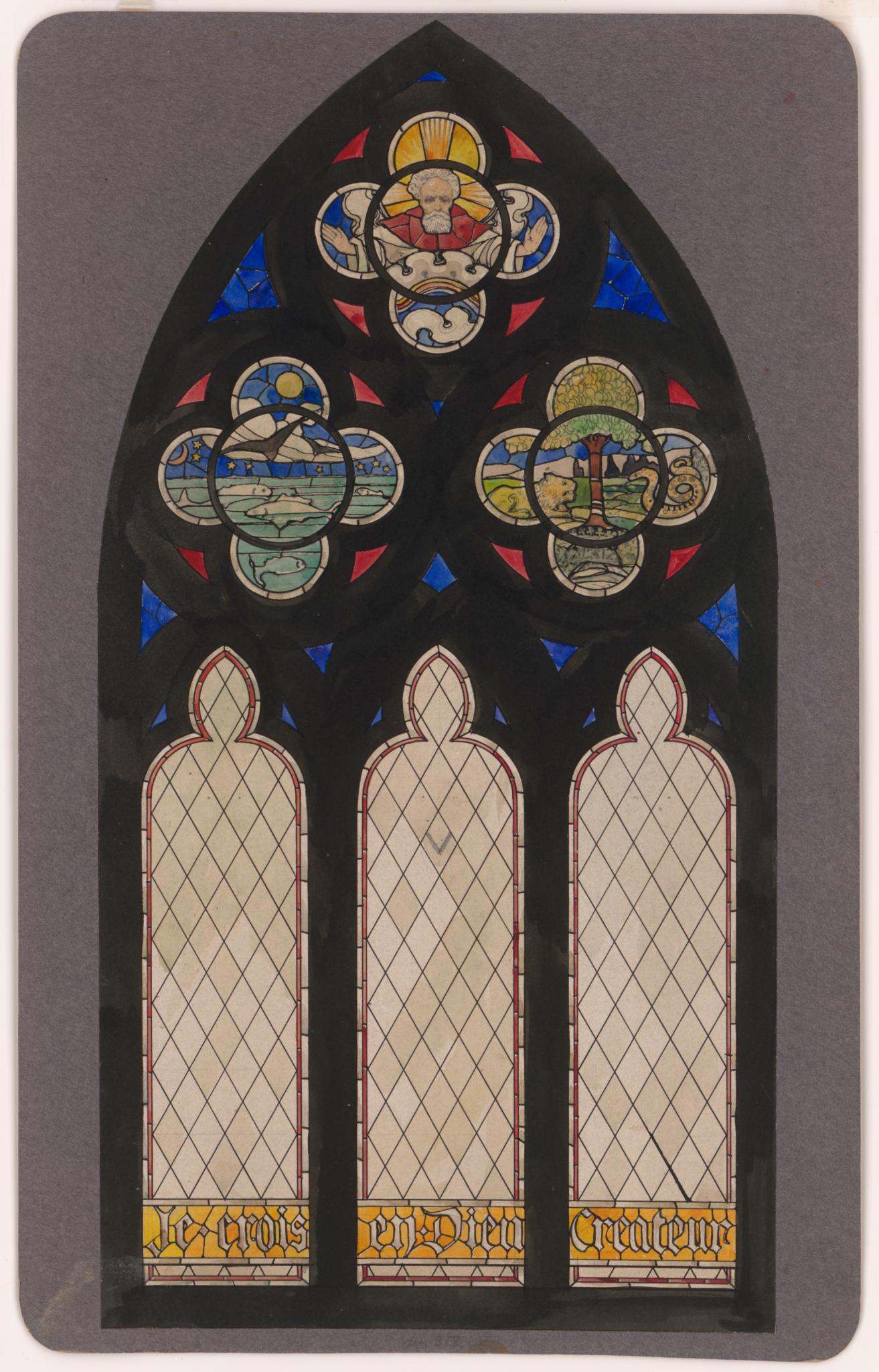 Dans cette maquette, Fortuné Bovard a choisi de représenter le cinquième et le sixième jour de la Création dans les quadrilobes inférieurs. Après examen des maquettes, l’abbé Gambon décide cependant de rassembler dans les trois quadrilobes les six premiers jours de la création et le récit du paradis. Le vitrail montre ainsi dans le quadrilobe supérieur Dieu le père créant la lumière, le soleil, la lune et les étoiles (KF_999). Dans celui de gauche, trois jours du récit de la création sont représentés au contraire de la maquette : la création et séparation des eaux et du ciel, la séparation de la terre et des mers, la création des plantes, oiseaux et poissons (KF_997). Le quadrilobe de droite représente à la fois la création des animaux, symbolisée comme sur la maquette par un lion auquel s’ajoute un chien sur le vitrail (correspondant aux animaux domestiqués), mais aussi celle de l’homme et de la femme (KF_996). L’idée du serpent est abandonnée, car pour l’abbé Gambon, rien ne doit rappeler le pêché au stade de la Création (Pasquier, 1999, p. 9-11).