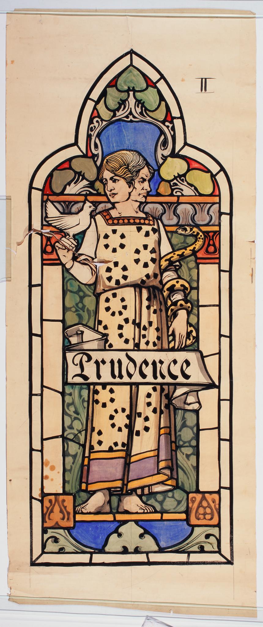 C’est sous l’égide de l’abbé Edouard Gambon que se déroule la réalisation des vitraux de la nouvelle église de Cugy, construite entre 1906 et 1907. L’abbé s’adresse pour cela à l’atelier Kirsch & Fleckner qui contacte Fortuné Bovard, alors probablement actif dans l’atelier d’Edouard Hosch pour la restauration des vitraux de la cathédrale de Lausanne. Possédant son propre atelier à Lausanne dès 1907, il semble qu’il travaille pour Cugy en sous-traitance de l’atelier Kirsch & Fleckner depuis le chef-lieu vaudois(Pasquier, 1999, p. 45-46, 56). Les vitraux, sans doute achevés et posés en août 1907, suivent le programme iconographique complexe élaboré en février 1907 par l’abbé et intitulé “Projets de vitraux” destiné à fournir des indications iconographiques à Fortuné Bovard (Pasquier, 1999, p. 48). Probablement en 1906, Bovard propose à Gambon, selon les souhaits de celui-ci, un premier projet (KF_181 et KF_182) pour les quatre fenêtres figurées hautes du choeur illustrant les évangélistes au centre, entourés de deux verrières ornementales avec un phylactère vide sur fond végétal, probablement destiné à accueillir une parole de l’évangile. Ce thème sera abandonné par Gambon au profit des quatre vertus cardinales (Pasquier, 1999, p. 34-35, 47).
