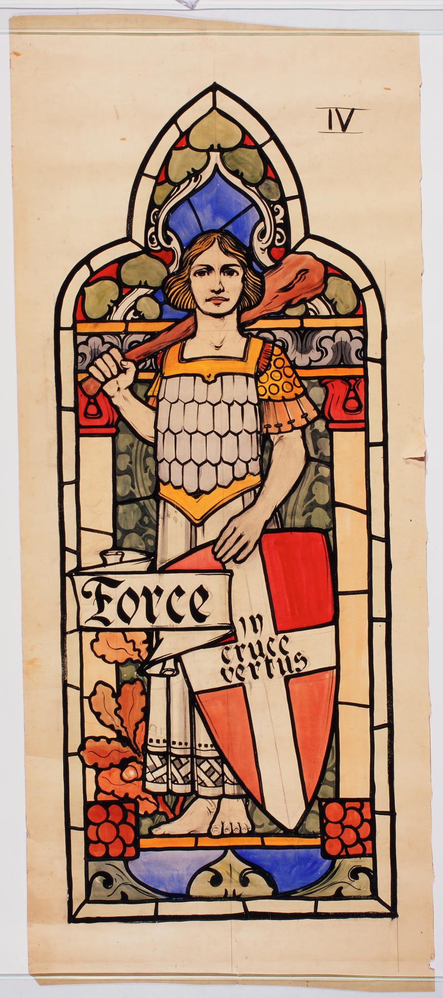 Probablement en 1906, Bovard propose à Gambon, selon les souhaits de celui-ci, un premier projet (KF_181 et KF_182) pour les quatre fenêtres figurées hautes du choeur illustrant les évangélistes au centre, entourés de deux verrières ornementales avec un phylactère vide sur fond végétal, probablement destiné à accueillir une parole de l’évangile. Ce thème sera abandonné par Gambon au profit des quatre vertus cardinales (Pasquier, 1999, p. 34-35, 47).