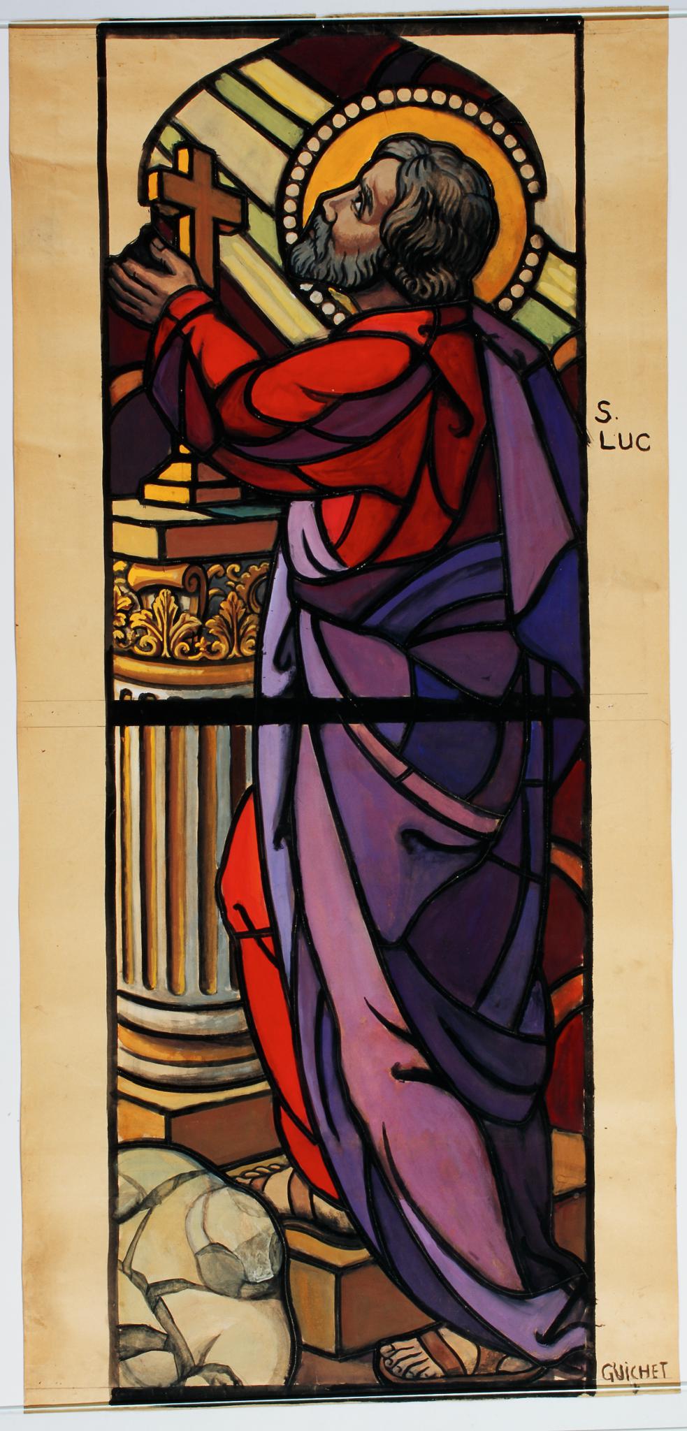 Ce carton en couleur est le modèle précis à l’échelle 1:1 de la partie figurée droite du vitrail consacré aux évangélistes Jean et Luc pour la fenêtre à double lancettes à droite dans le choeur de l’église Saint-Jacques à Nuvilly. Le cadre ornemental fait l’objet d’un carton séparé, le KF_891, comme les ajours de réseau qui sont illustrés sur le KF_894. Par contre, nous n’avons retrouvé aucun carton pour les symboles des évangélistes représentés dans la partie ornementale inférieure de chaque lancette.