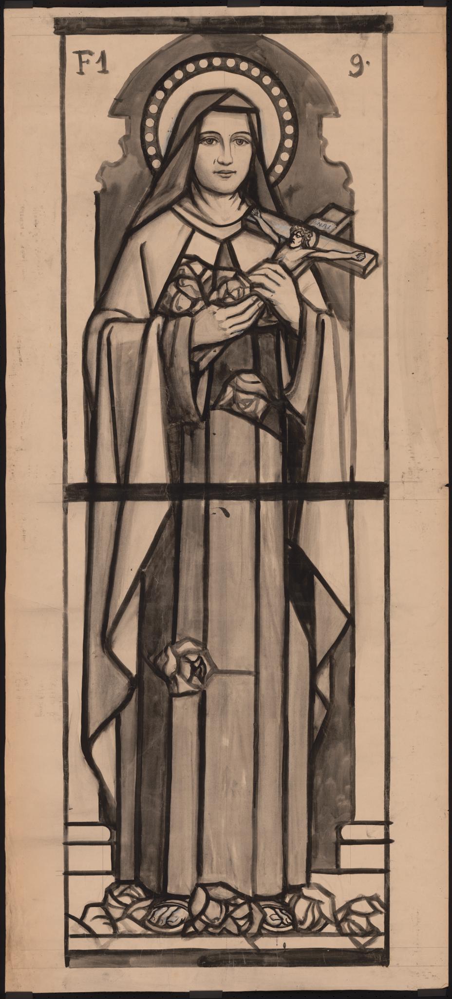 Ce carton en noir et blanc est le modèle précis à l’échelle 1:1 de la partie figurée gauche du vitrail à double lancettes consacré à sainte Thérèse de Lisieux et la Vierge à l’Enfant pour la deuxième fenêtre à gauche dans la nef de l’église Saint-Jacques à Nuvilly. Le cadre ornemental fait l’objet d’un carton séparé, le KF_891, comme les ajours de réseau illustrés sur le KF_894. Le motif de la rose dans la partie ornementale inférieure de la lancette gauche figure sur le carton de la partie inférieure du cadre ornemental, le KF_891.
