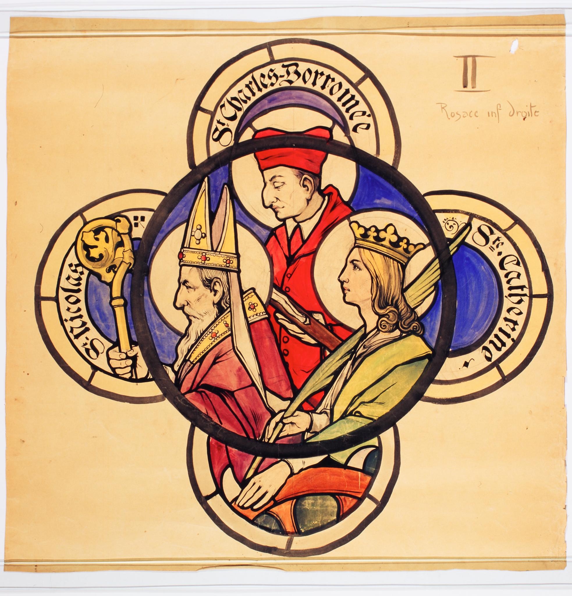 St-Nicolas // St Charles Borromée // Ste · Catherine · (sur la bordure des trois lobes supérieurs du quadrilobe)