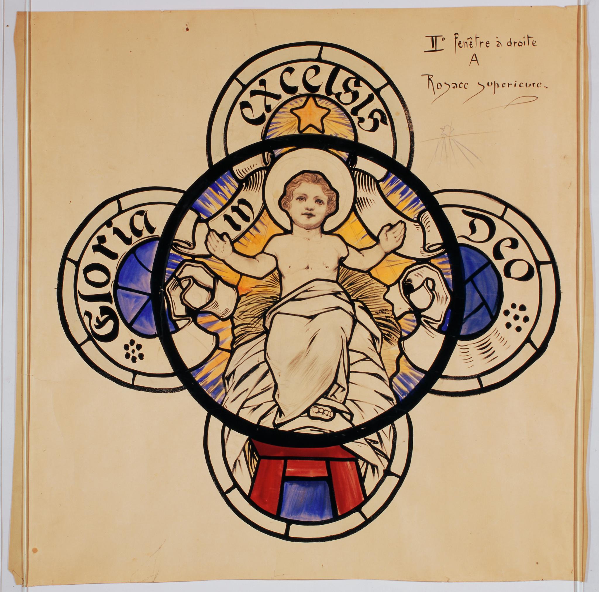 Ce carton en couleur à l’échelle 1:1 est le projet définitif pour le quadrilobe supérieur de la verrière de la deuxième travée de la nef à droite de l’église Saint-Martin de Cugy, dédiée au thème “Je crois au fils de Dieu fait homme”. Cette fenêtre comprend deux autres quadrilobes dans lesquels sont représentées la création d’Adam et Eve et la Vierge à l’enfant (Pasquier, 1999, p. 14-17).