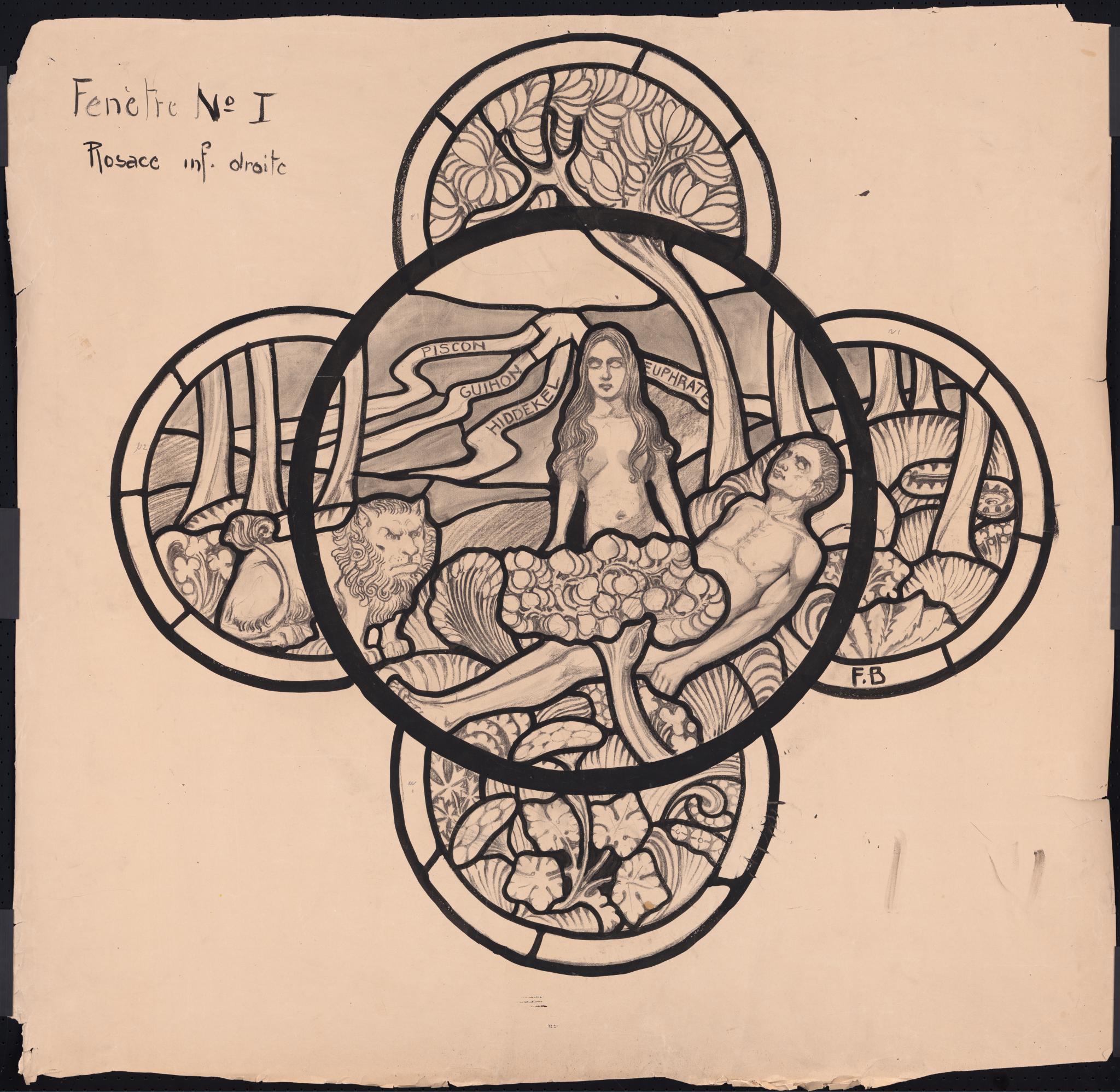 Ce carton en noir et blanc à l’échelle 1:1 est le projet définitif pour le quadrilobe droit du vitrail de la première travée à droite dans la nef de l’église Saint-Martin de Cugy, sur le thème : “Je crois en Dieu créateur”. Cette fenêtre comprend deux autres quadrilobes dans lesquels sont représentés les autres jours de la création (Pasquier, 1999, p. 9-11).