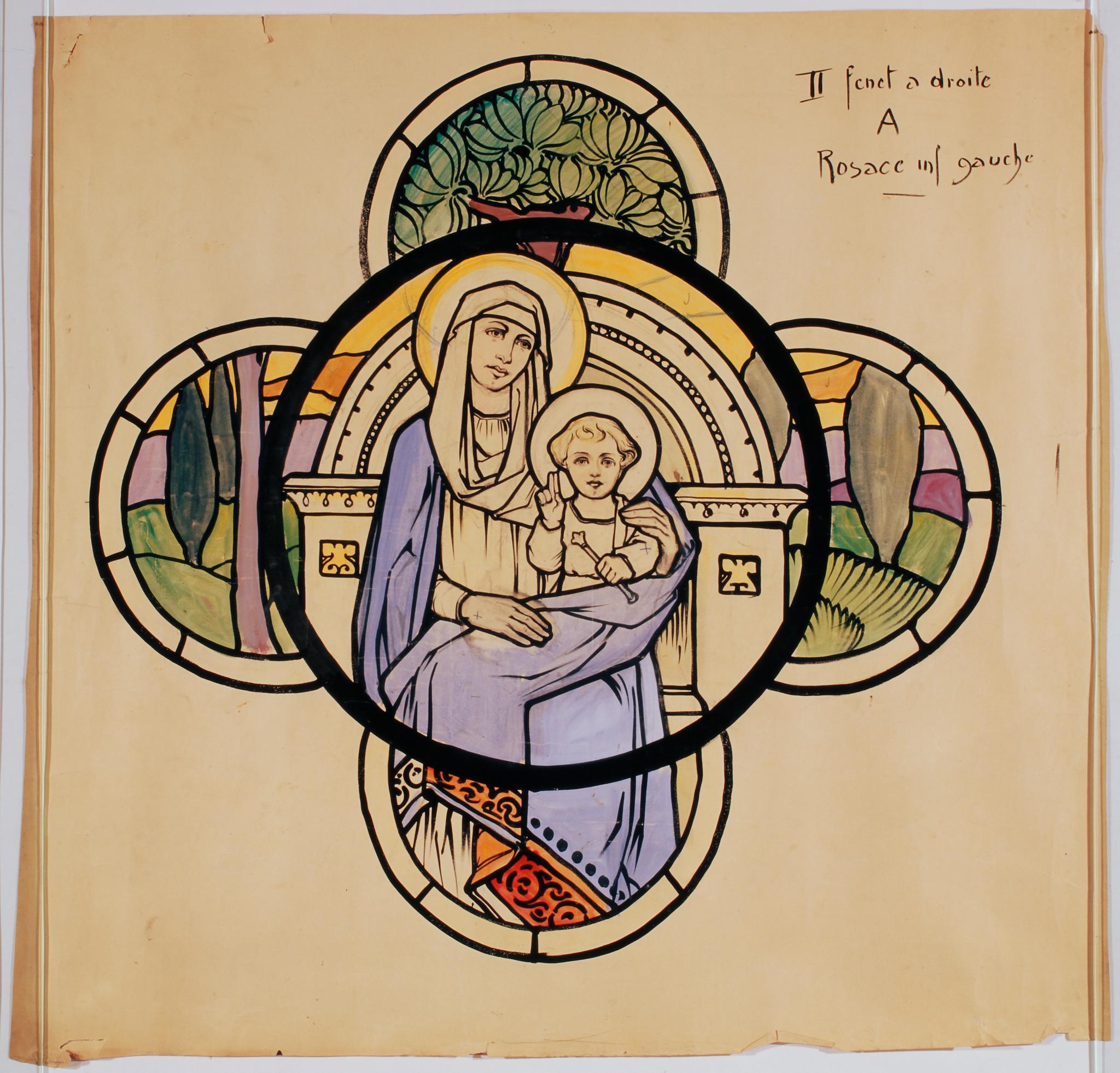 Ce carton en couleur à l’échelle 1:1 est le projet définitif pour le quadrilobe inférieur droit de la verrière de la deuxième travée à droite dans la nef de l’église Saint-Martin de Cugy, dédiée au thème “Je crois au fils de Dieu fait homme”. Cette fenêtre comprend deux autres quadrilobes dans lesquels sont représentées la création d’Adam et Eve et la Nativité (Pasquier, 1999, p. 14-17).