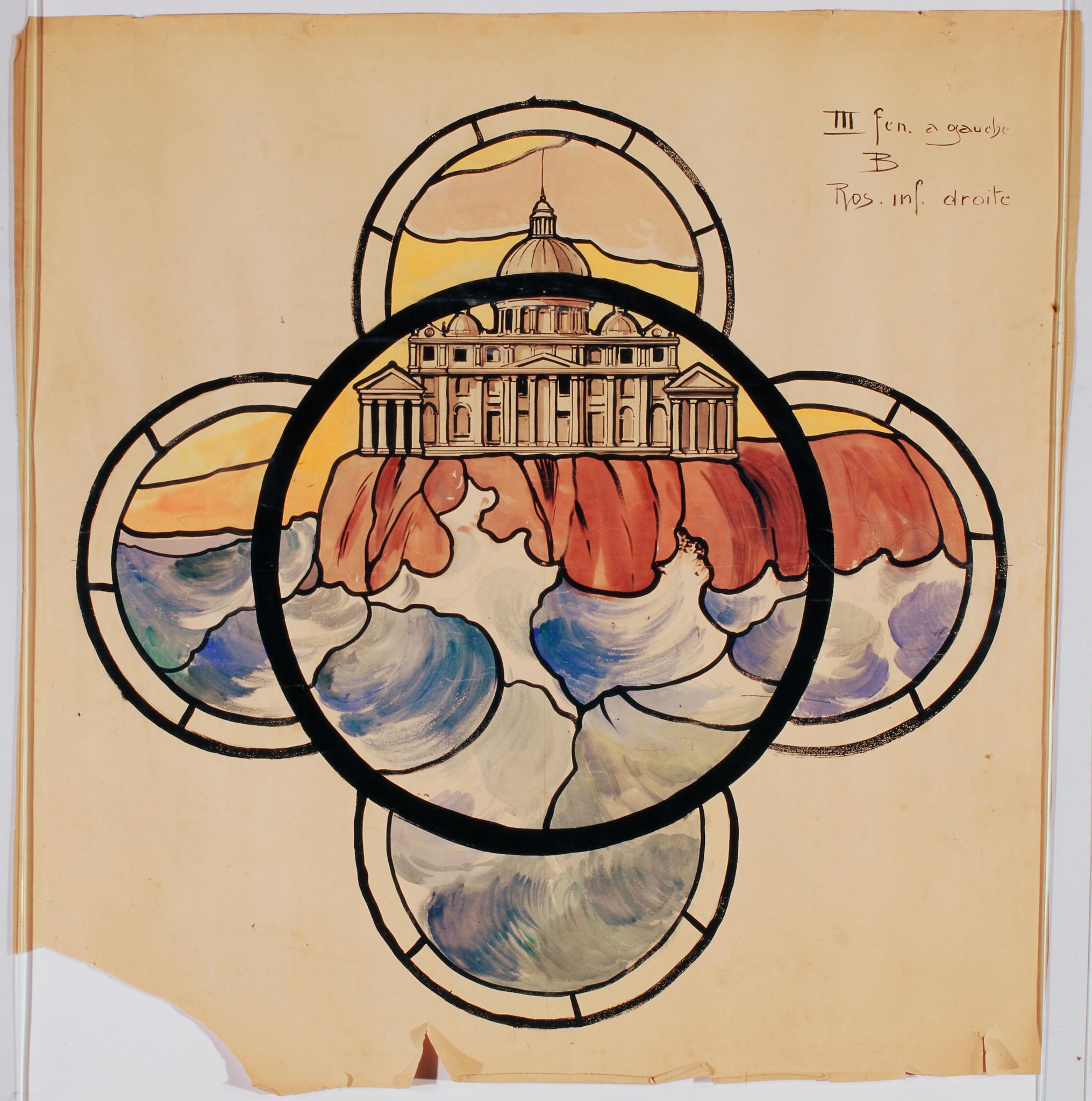 Ce carton en couleur à l’échelle 1:1 est le projet définitif pour le quadrilobe inférieur droit de la verrière de la troisième travée à gauche dans la nef de l’église Saint-Martin de Cugy, dédiée au thème “Je crois en la sainte Eglise catholique”. Cette fenêtre comprend deux autres quadrilobes dans lesquels sont représentées la barque de saint Pierre et la Pentecôte (Pasquier, 1999, p. 21-23).