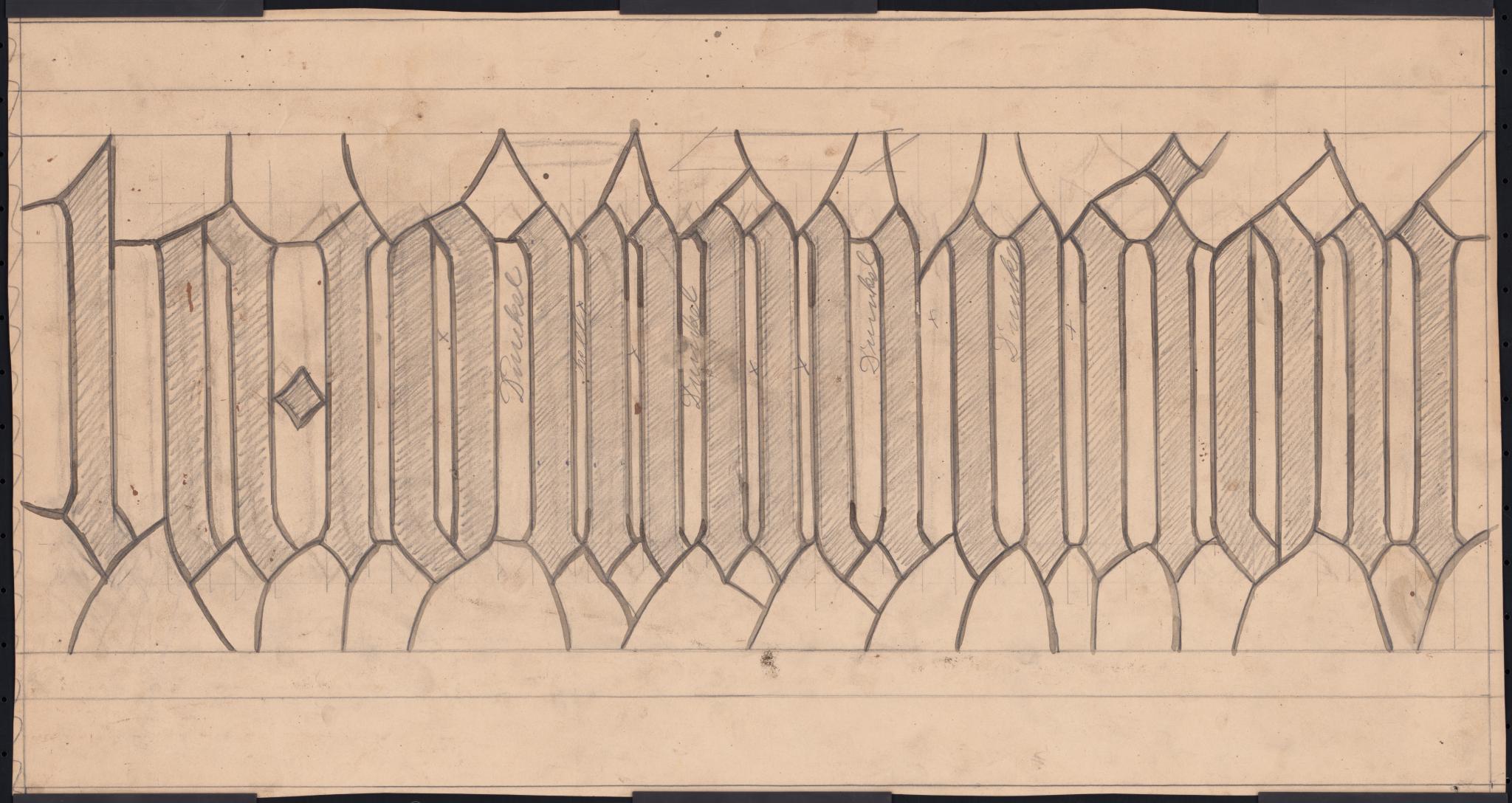 Inscription partielle en lettres gothiques, pour le bas d'un vitrail.