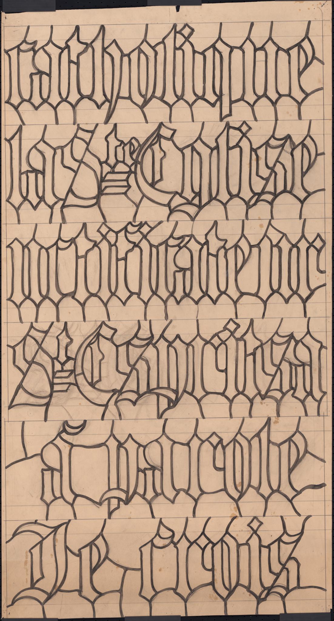 Ce carton en noir et blanc à l’échelle 1:1 est le projet définitif pour les inscriptions se situant sur les banderoles du centre et de droite au bas des lancettes pour les deuxième et troisième verrières à gauche et la quatrième fenêtre à droite dans la nef de l’église Saint-Martin de Cugy.