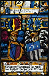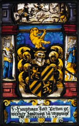 Das gevierte Wappen des Stifters erscheint über einem marmorierten Boden vor der mittleren Öffnung einer dreiteiligen Architektur. Zwischen ihrem verkürzt gesehenen Architrav prangt eine Volutenkartusche mit einem Puttenkopf. Vor den seitlichen Öffnungen stehen zwei weibliche Tugendallegorien über hohen Pilastern: die Gerechtigkeit (Justitia) links mit verbundenen Augen, Schwert und Waage, die Mässigkeit (Temperantia) rechts mit Wasserkrug und Schale. Den Scheibenfuss füllt eine rollwerkgerahmte Tafel mit der Stifterinschrift.