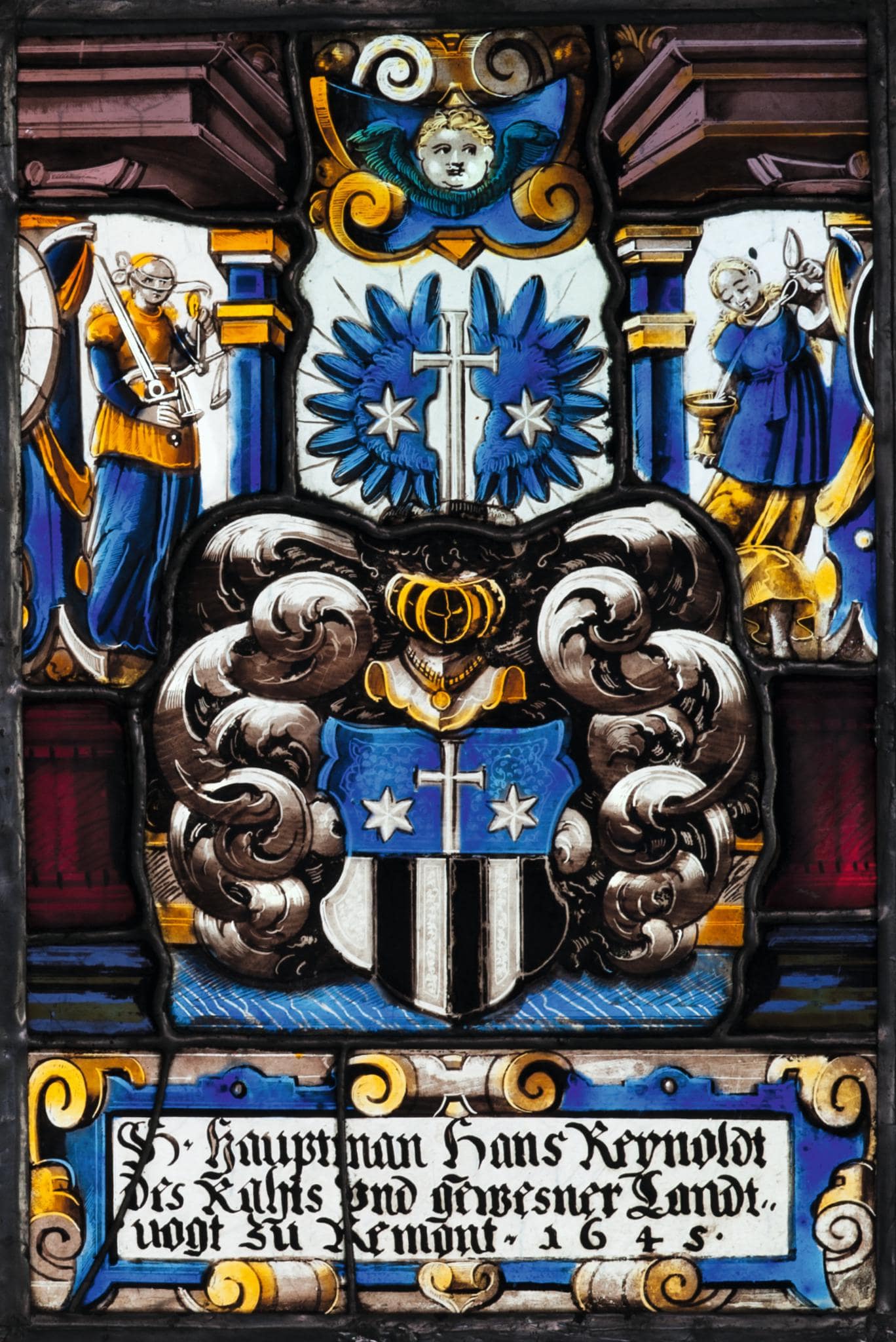 Stifterinschrift: H. hauptman Hans Reynoldt / des Rahts vnd gewesner Landt= / uogt zu Remont. 1645.