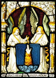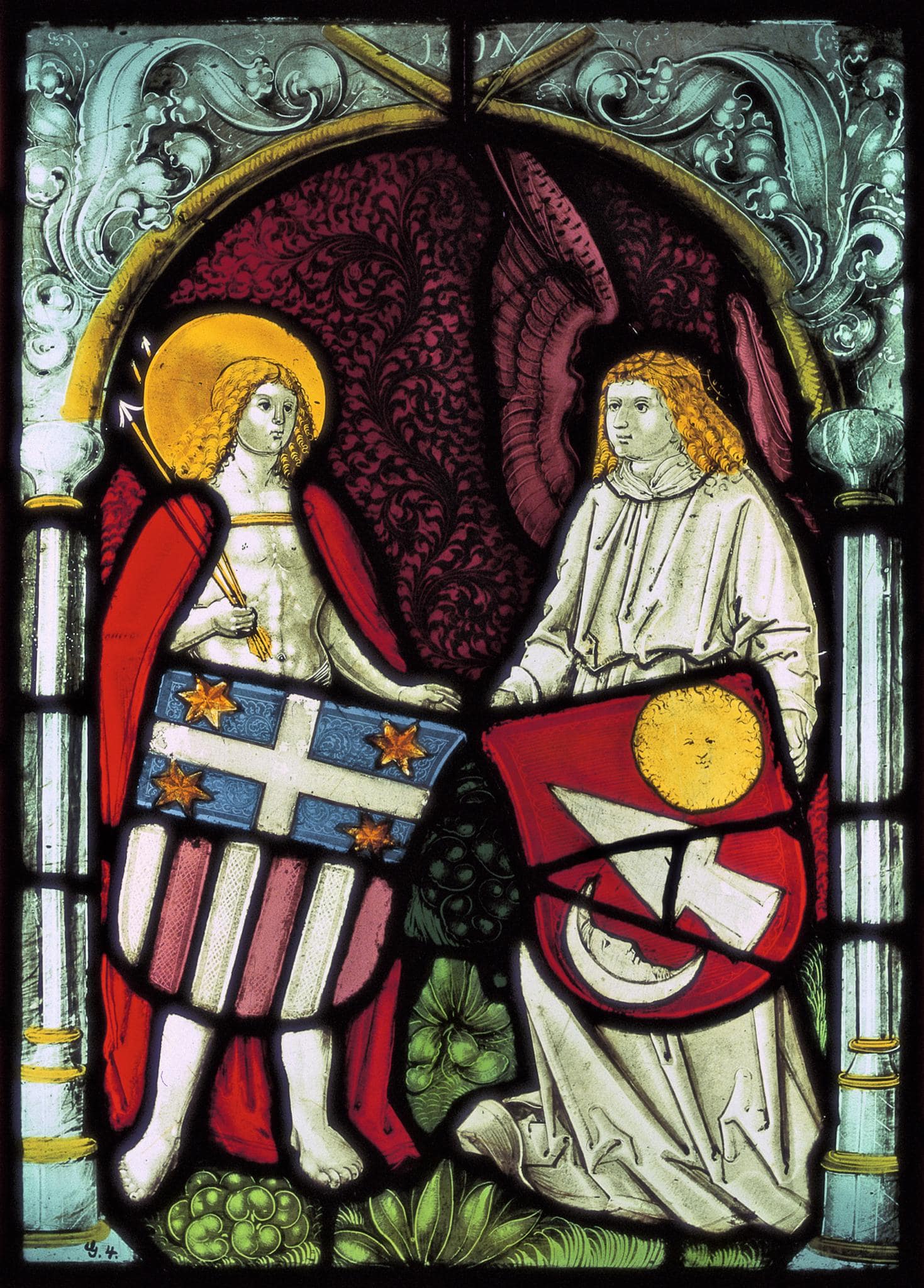Die beiden unbekannten Wappen werden vom hl. Sebastian (links) und einem Engel (rechts) in Hüfthöhe gehalten. Der blondgelockte Heilige trägt über dem blossen Körper einen roten Mantel und umfasst mit der rechten Hand die drei Pfeile seines Martyriums. Der Engel ist in eine lange Albe gekleidet, deren Falten sich am Boden stauen. Sein rosaroter rechter Flügel ragt vor dem roten Spiralrankengrund steil in die Luft, während der linke von der Rahmenarchitektur angeschnitten ist. Die dünnen, vor Vierkantpfeilern stehenden Säulen mit den kissenartigen Kapitellen tragen einen Astbogen mit Akanthuslaub, dessen gekreuzte Enden im Scheitel die Jahrzahl 1517 einschliessen.