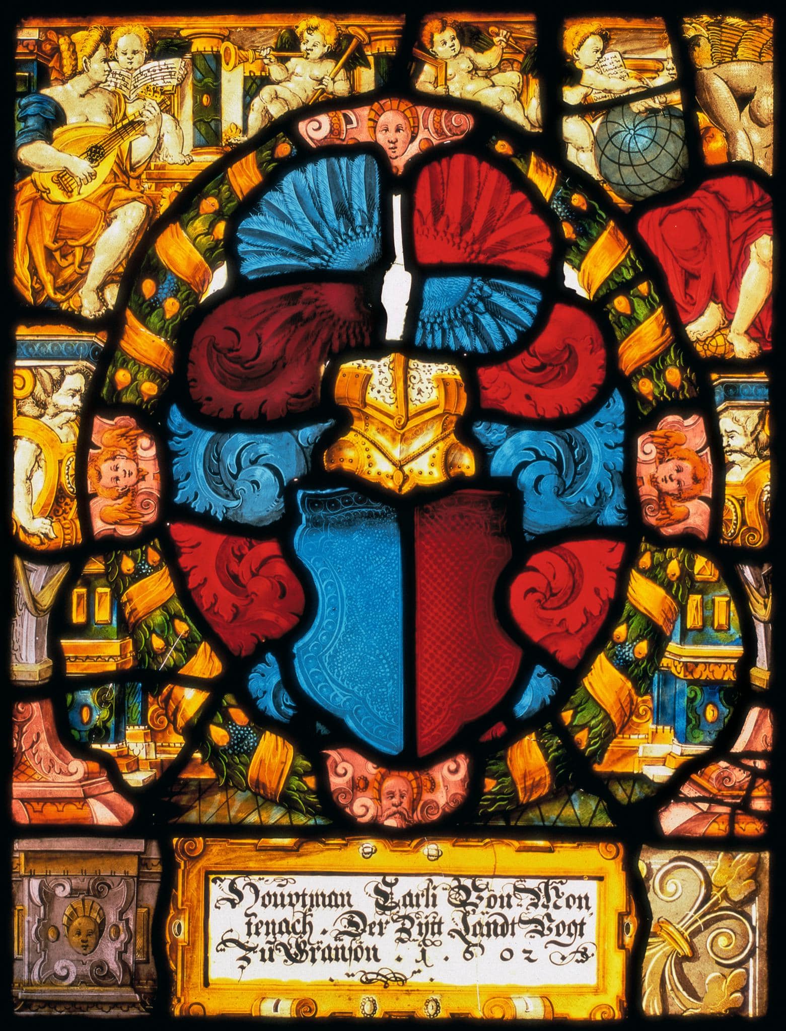 In einem hochovalen Blätterkranz mit Früchten und gelben Bändern nimmt über Fliesenboden das volle Wappen fast die ganze Fläche des farblosen Grundes ein. Die vier Enden des Kranzes sind mit maskengeschmückten Rollwerkkartuschen markiert. Um den ovalen Mittelteil legt sich eine reiche Rahmenarchitektur mit Atlanten, die über den Podesten vor Pilastern als Träger der Zwickelfiguren dienen. Musica spielt die Laute und wird von zwei Putten mit Notenblatt und Trompete begleitet. Sie trägt einen gelben Rock und ein blaues Mieder. Geometria oder Astronomia, in Rot gekleidet, studiert die Weltkugel. Ein Putto zu ihrer Seite hält die Schreibfeder und ein beschriebenes Blatt. Zwischen violetten Podesten mit Maskenschmuck (rechtes Podest durch Flickstück ersetzt) steht die Rollwerktafel mit der Stifterinschrift auf farblosem Grund.
