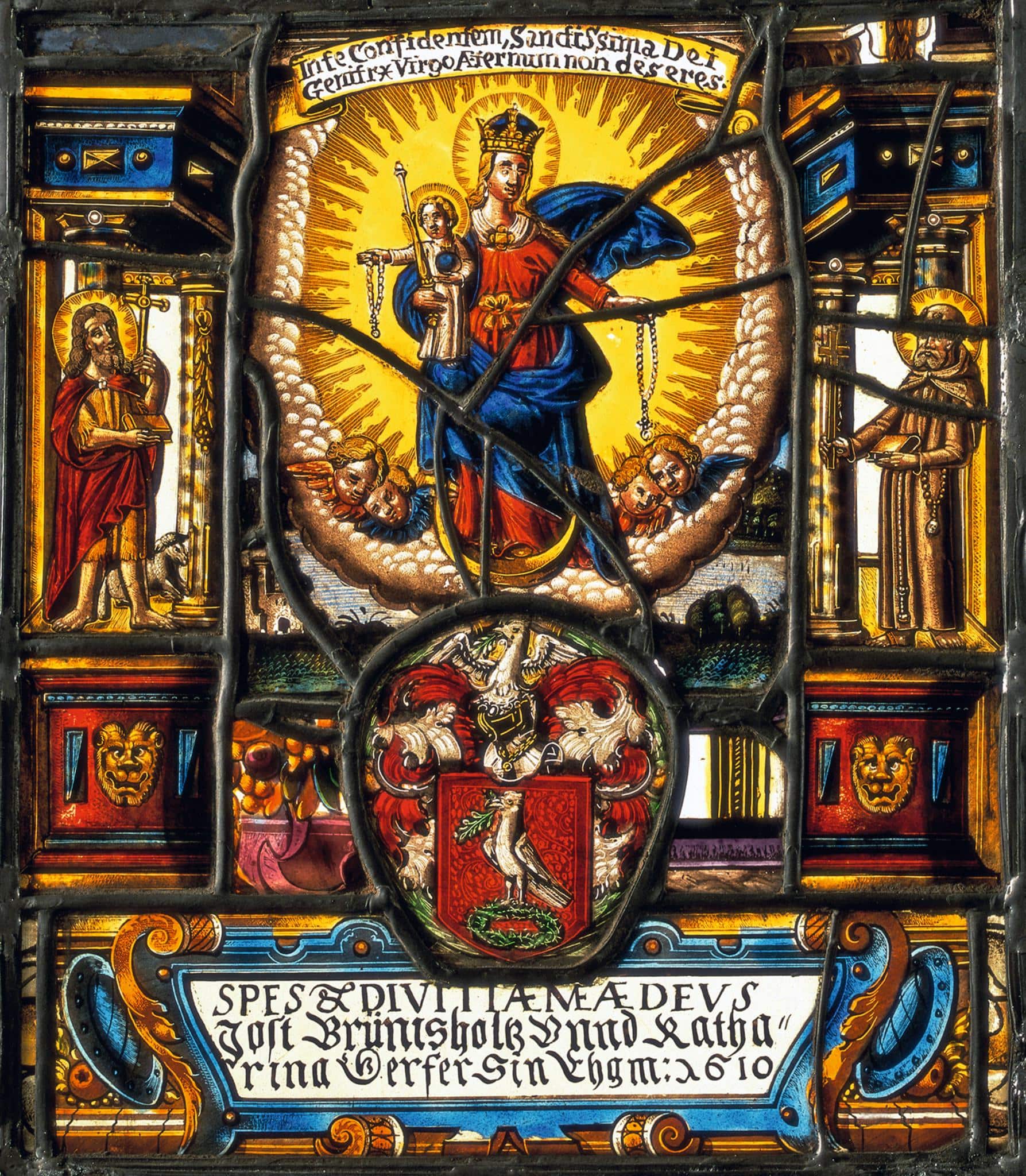 Der grössere Teil der zusammengestückelten Scheibe gehört der Zeit um 1700 an. Über einer Flusslandschaft erscheint die Muttergottes auf der Mondsichel in einem umwölkten und mit Putten belebten Strahlenkranz. Sie ist in ein rotes Gewand und einen blauen Mantel gekleidet und präsentiert mit der Linken den Rosenkranz. Das Jesuskind in ihrem rechten Arm trägt eine weisse Tunika, in den Händen hält es die Weltkugel und den Rosenkranz. Die Rahmenarchitektur ist aus marmorierten Säulen über roten Podesten mit Löwenkopfmasken gebildet, die einen verkürzten blauen Architrav tragen. In den seitlichen Architekturöffnungen stehen links Johannes der Täufer in gelbem härenem Gewand und rotem Mantel, rechts der hl. Franziskus, in der rechten Hand das Kreuz, in der Linken das Buch haltend. An seinem Gürtel hängt ein Rosenkranz mit einem Totenkopf. Die Bildszene schneidet ein eingeflicktes Wappen in ovalem, beschnittenem Lorbeerkranz an. Es überlappt auch den oberen Rand der älteren, angefügten Inschriftkartusche, die von Schilden und Früchten gerahmt wird und die neben den Stifternamen auch eine lateinische Devise “Gott bedeutet mir Hoffnung und Reichtum” aufnimmt.