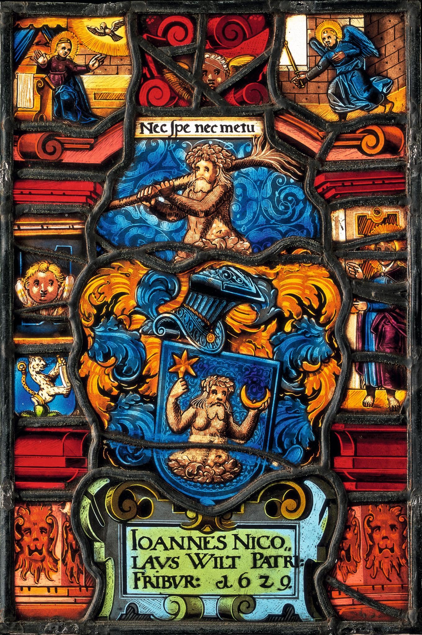 Vor blauem Rankendamast ist das volle Wappen unter der Devise des Stifters dargestellt: “Weder Hoffnung, noch Furcht”. Von seinen Namenspatronen vor den rahmenden Pilastern hat sich rechts der den Kelch segnende Evangelist Johannes in blauem Gewand und violettem Mantel erhalten, während der hl. Nikolaus links durch Flickstücke ersetzt wurde. Über den roten Kapitellen setzt ein rotbrauner Bogen mit Volutenenden an, dessen Scheitel von einer Puttenkopfkartusche überdeckt wird. In den Zwickeln ist die Verkündigung dargestellt. Links kniet Maria in ihrem Schlafgemach beim Himmelbett vor dem Betpult. Gekleidet in ein violettes Gewand und einen blauen Mantel, wendet sie sich mit ausgebreiteten Armen der Taube zu. Rechts erscheint der Erzengel Gabriel mit wehendem blauen Gewand und dem Zepter in der Rechten. Am Fuss der Scheibe steht zwischen den rotbraunen Podesten mit Löwenkopfmasken die blaue und grüne Rollwerkkartusche mit der Stifterinschrift.