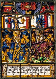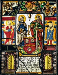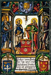 Vor einer zweiachsigen Architektur stehen über gelbem Boden die einander leicht zugeneigten Wappen der Stifter. Die ganze Breite der Scheibe einnehmend, verdecken sie grossteils das rahmende Säulen-Pilasterpaar und die blau marmorierte Mittelsäule mit grünem Kapitell. Die Helmzier steht links vor hellgelbem, rechts vor farblosem Grund. Am Fuss der Scheibe nimmt ein gelbgerahmter Sockel die Stifterinschrift auf farblosem Grund auf.