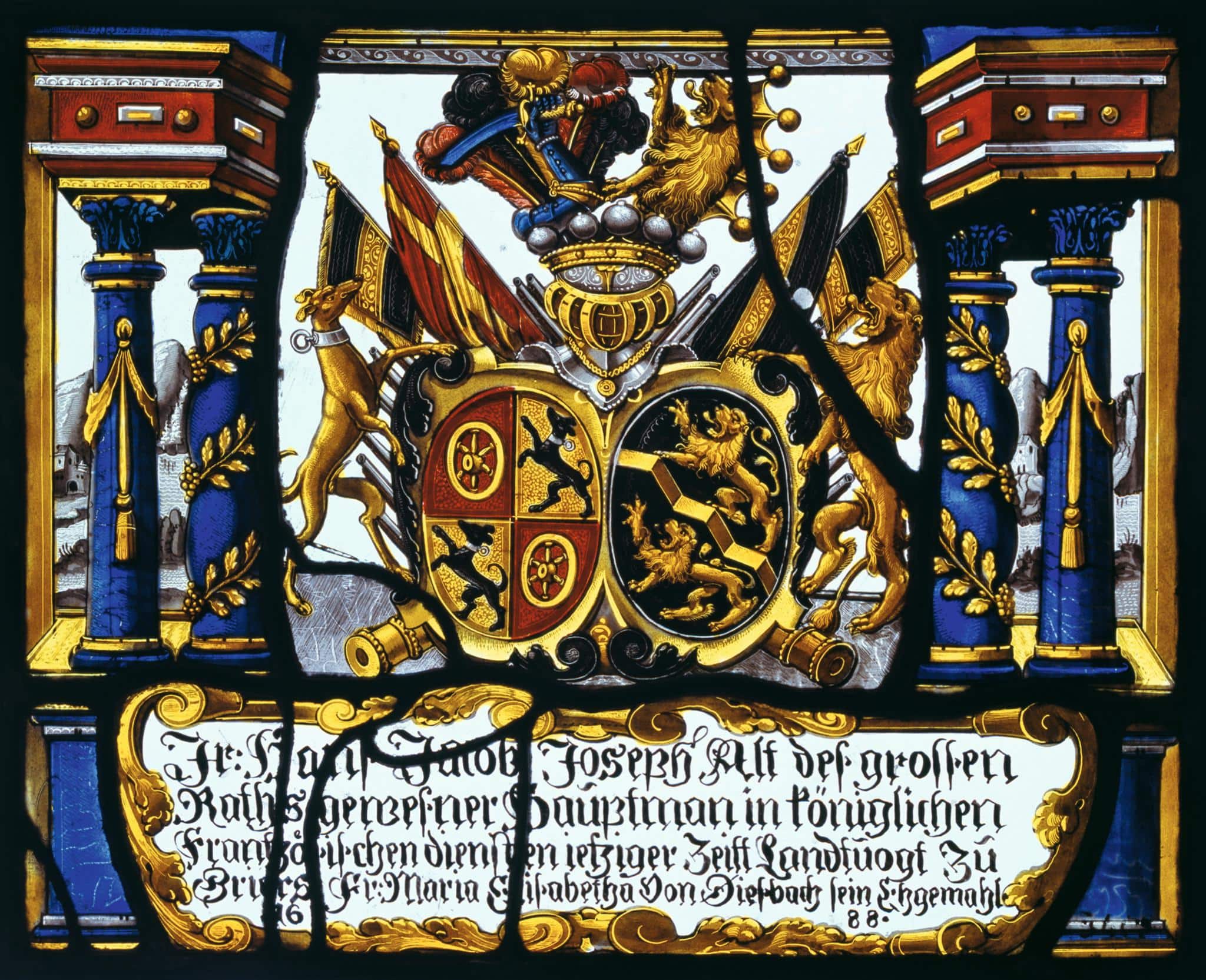 Stifterinschrift: Jr: Hans Jacob Joseph Alt des grossen / Raths gewesner Hauptman in königlichen / Frantzoͤsischen diensten ietziger Zeitt Landtuogt zu / Griers Fr: Maria Elisabetha von Diesbach sein Ehgemahl / 1688.