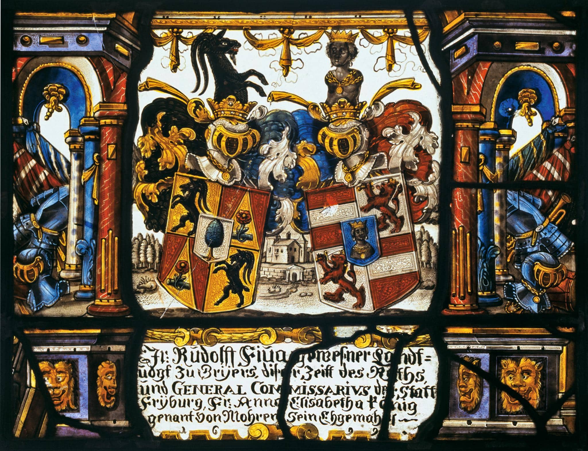 Stifterinschrift: Jr: Rudolff Fiua gewesner Landt= / uogt zu Grÿers, diser Zeitt des Raths, / und General Commissarivs der Statt / Frÿburg, Fr: Anna Elisabetha König genant von Mohren sein Ehgemah[e]l / 1699.