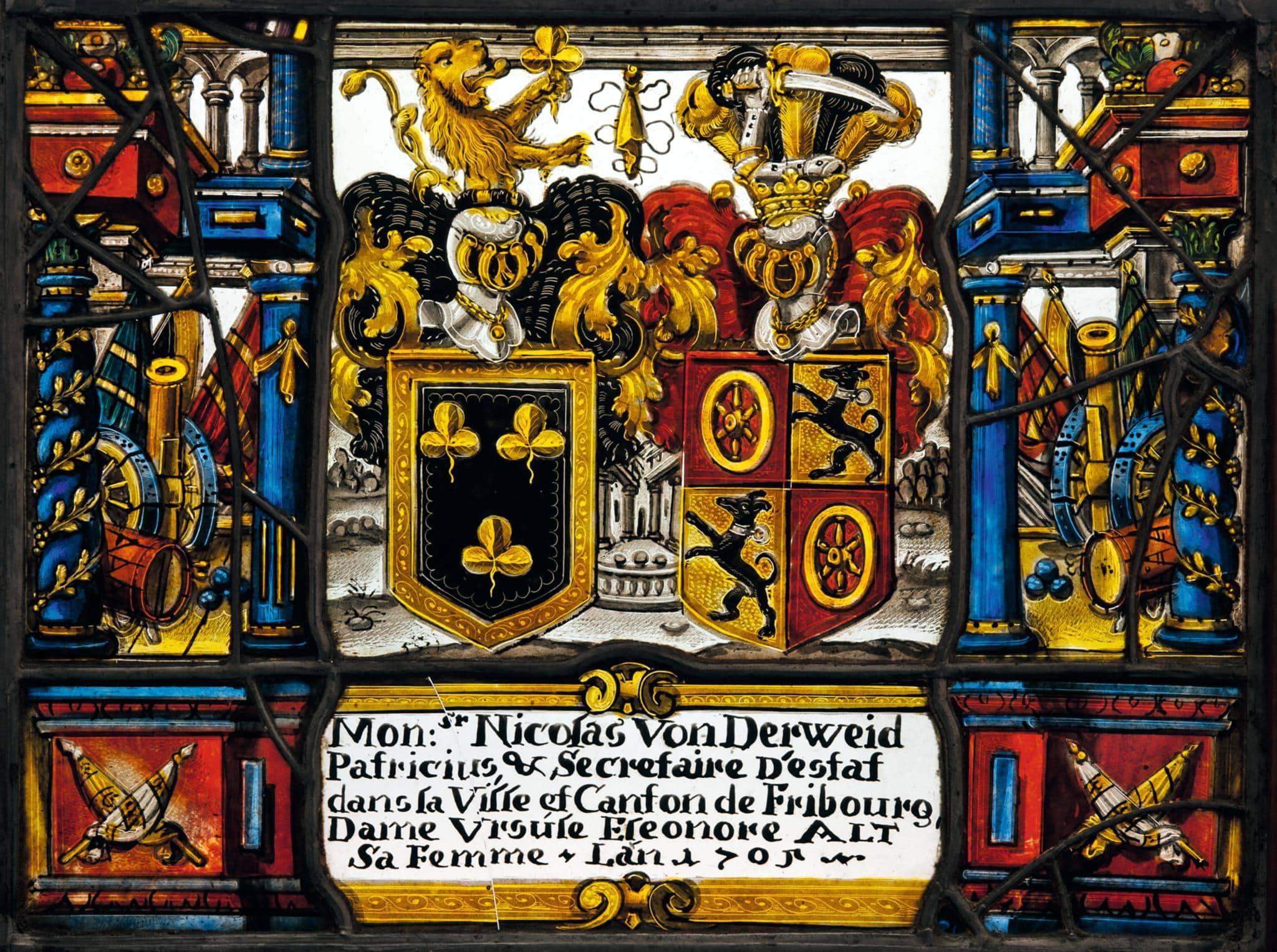 Stifterinschrift: Mon:sr Nicolas VonDerweid / Patricius, & Secretaire D'estat / dans la Ville et Canton de Fribourg, / Dame Vrsule Eleonore ALT / Sa Femme. L'an 1705.
