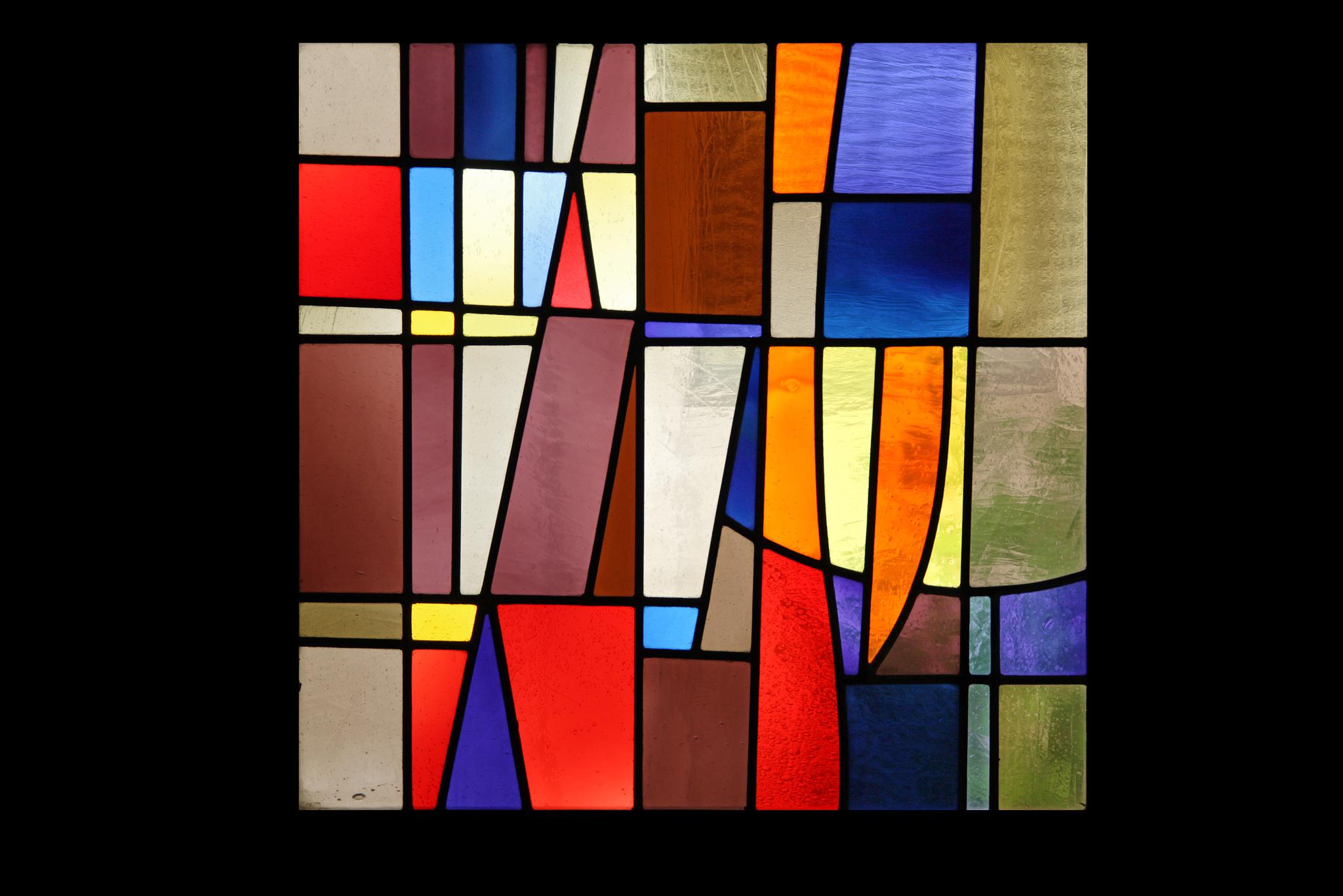 Vitrail non figuratif carré constitué de lignes courbes et droites et de verres bleus, gris, jaunes, rouges, verts et bruns.