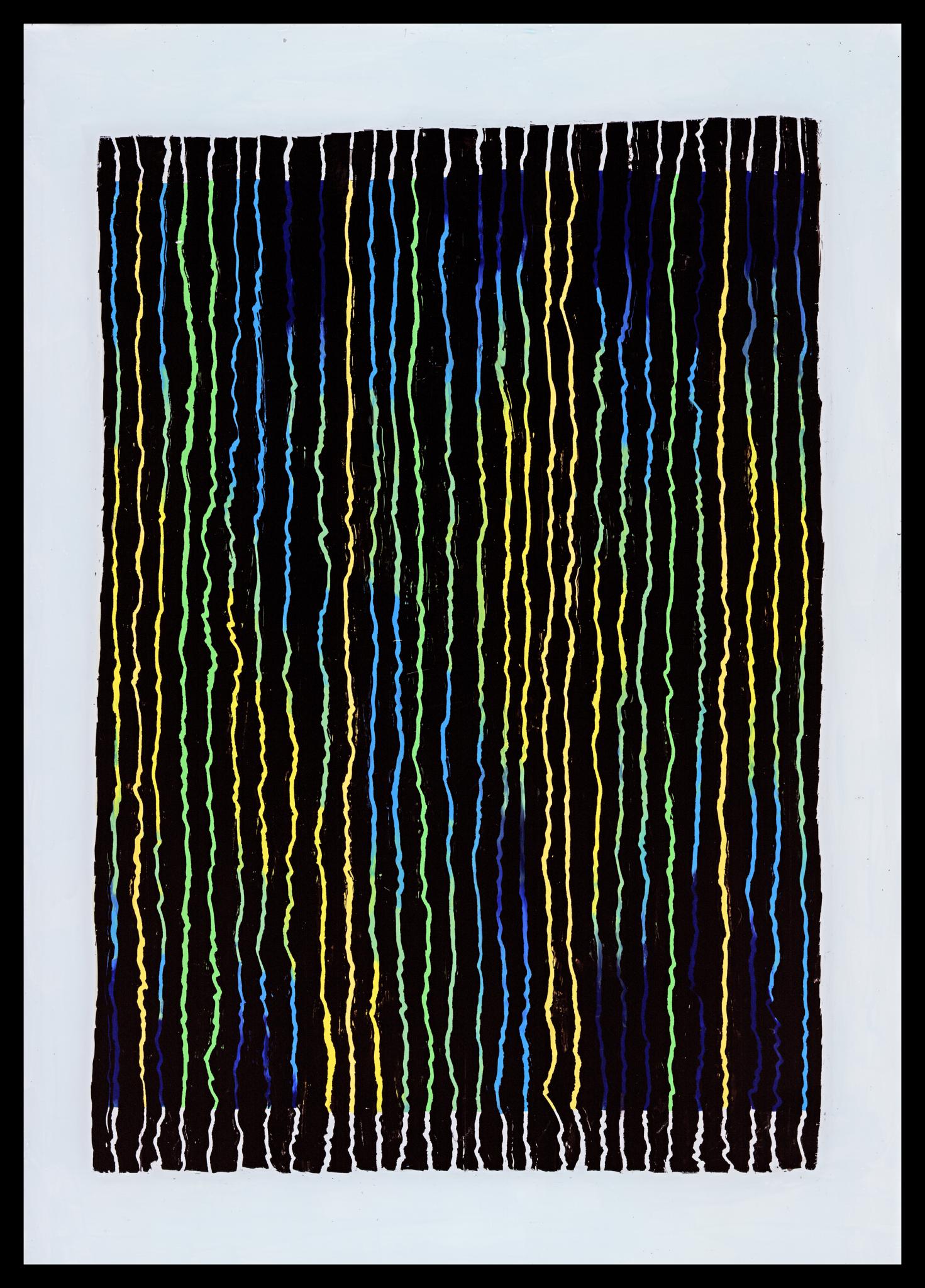 Dieses Hinterglasbild weist Techniken auf, die Jochem Poengsen im Sommer 2013 auf Papierarbeiten anwendete. Die Tusch- und Aquarellzeichnungen schuf er mittels einer Maskierflüssigkeit, die ihm erlaubte, mehrere Farbschichten übereinander zu legen und zahlreiche Parallelen zur Technik der Hinterglasmalerei zu ziehen. Diese Experimente lösten in ihm den Wunsch aus, diese neuen Möglichkeiten auf Glas zu erproben.
