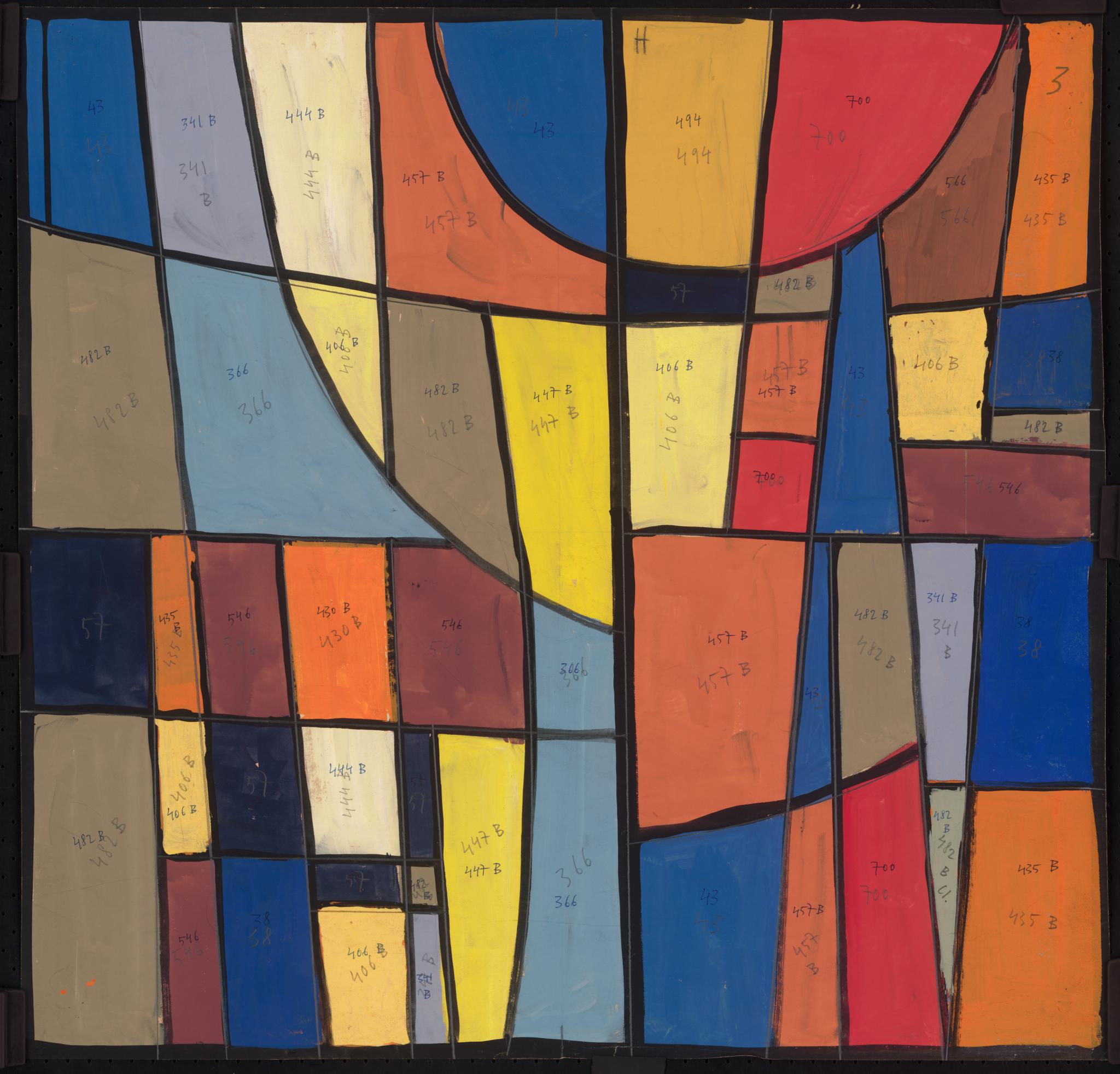 Ce carton de Bodjol est le projet définitif pour l'une des vingt verrières (GE_172.01) commandées en 1983 à l’artiste par Jean-Jacques Buard, alors pasteur de la paroisse protestante de Cointrin-Avanchet, pour orner les dix paires de fenêtres carrées du Centre communautaire oecuménique d'Avanchet. Celui-ci a été vendu en 2016 par les églises protestante et catholique à l’église pentecôtiste, qui a déposé l’ensemble des verrières, sauvé in extremis par l’Association pour la Promotion de l’Art Sacré (APAS) (Buard, 2018). La même année, six verrières ont été offertes par l’APAS à la chapelle des Crêts au Grand-Saconnex, deux en 2017 au Vitromusée Romont, et cinq à la paroisse protestante d’Anières en 2018. Sept verrières, dont celle correspondant à ce carton, sont encore propriété de l'APAS et pourraient être offertes à d'autres paroisses qui souhaiteraient orner leur sanctuaire d'une ou plusieurs de ces verrières.
