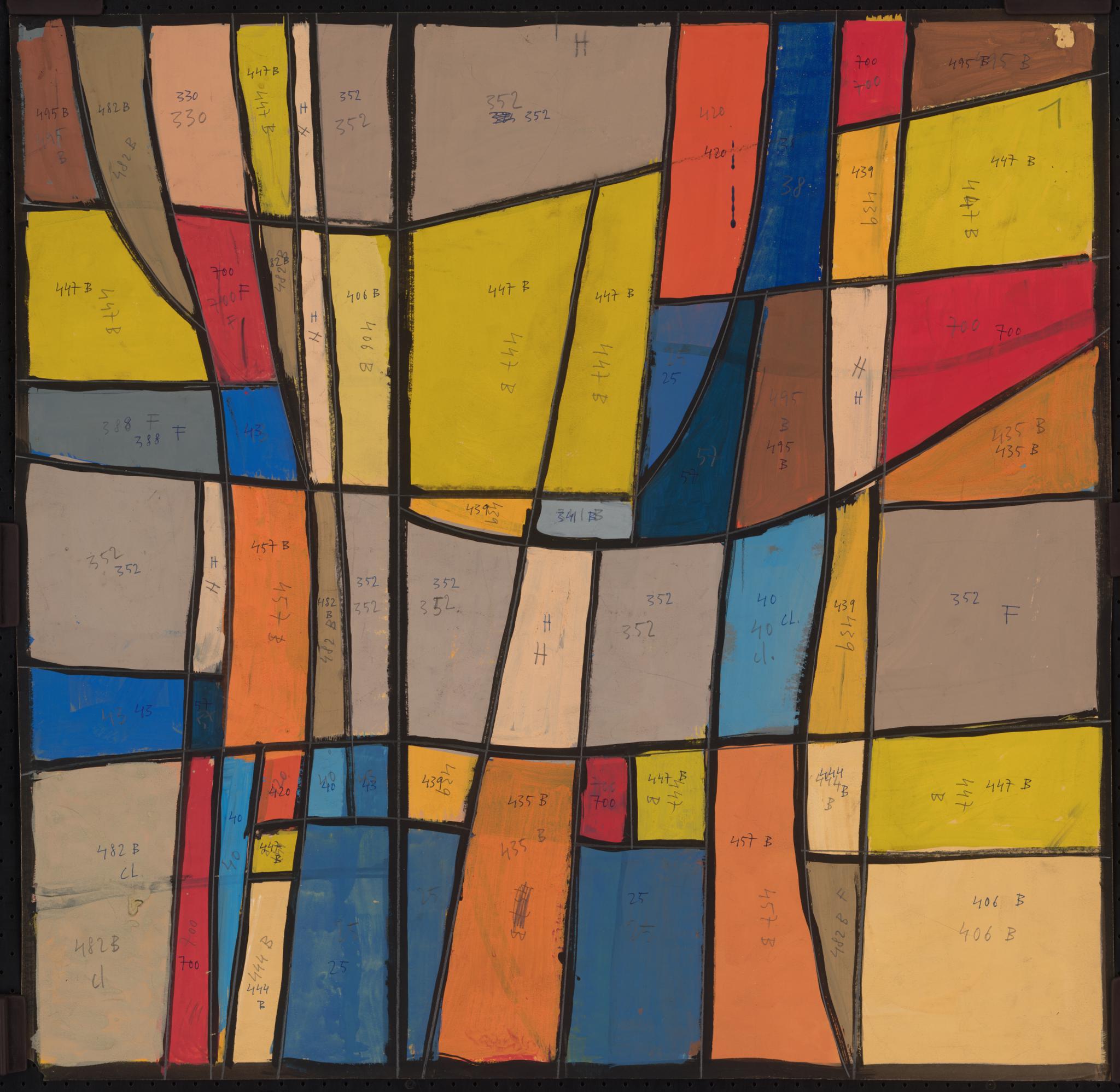 Ce carton de Bodjol est le projet définitif pour l'une des vingt verrières (GE_118.05) commandées en 1983 à l’artiste par Jean-Jacques Buard, alors pasteur de la paroisse protestante de Cointrin-Avanchet, pour orner les dix paires de fenêtres carrées du Centre communautaire oecuménique d'Avanchet. Celui-ci a été vendu en 2016 par les églises protestante et catholique à l’église pentecôtiste, qui a déposé l’ensemble des verrières, sauvé in extremis par l’Association pour la Promotion de l’Art Sacré (APAS) (Buard, 2018). La même année, six verrières ont été offertes par l’APAS à la chapelle des Crêts au Grand-Saconnex, deux en 2017 au Vitromusée Romont, et cinq à la paroisse protestante d’Anières en 2018. Sept verrières sont encore propriété de l'APAS, dont celle correspondant à ce carton, et pourraient être offertes à d'autres paroisses qui souhaiteraient orner leur sanctuaire d'une ou plusieurs de ces verrières.